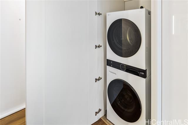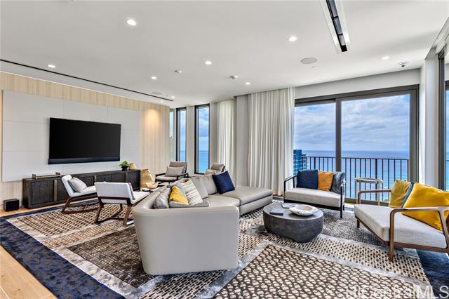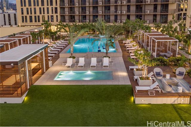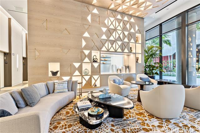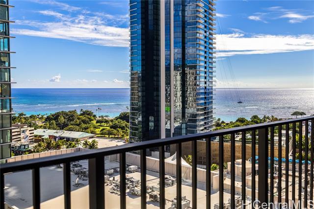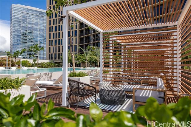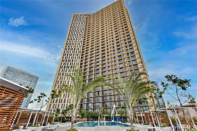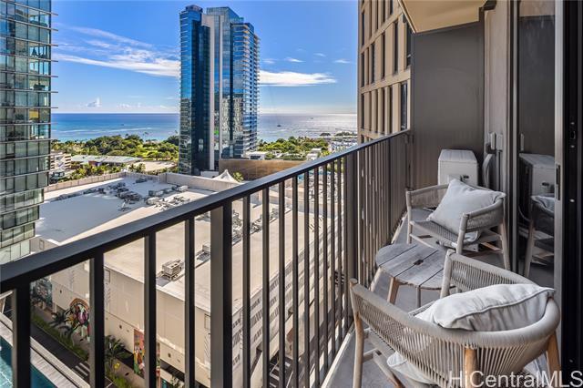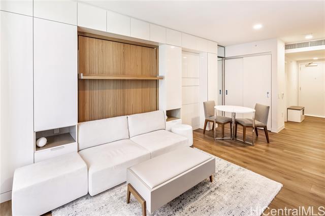 Immaculate gorgeous ocean-view studio with a lanai at A'ali'i in Ward Village, completed in 2021. Features sleek European-style cabinetry, custom Murphy bed, floor to ceiling cabinets and thoughtfully designed storage. The modern kitchen showcases clean European design with glossy integrated cabinetry, stone counters, a full height marble style backsplash, premium stainless steel Bosch appliances and polished fixtures - elegant, efficient and beautifully connected to the living space. Sold fully furnished with A/C, appliances, furnitures, new washer/dryer and dishware included. Enjoy the 8th floor resort deck with pool, spa, keiki pool, BBQ cabanas, lounges and play areas. The 42nd-floor Sky Deck offering a fitness center, yoga studio, lounge spaces, game room and open air terrace overlooking the city and coastline. Includes 1 covered assigned parking stall, generous guest and retail parking stalls, pet friendly living, surf/bike storage, dog park/shower room and 24 hour staff. Steps to Whole Foods, Ward Village, Shopping outlets, dining, parks and Ala Moana Beach. This residence blends modern island living with a clean European feel in Honolulu's premier planned community.