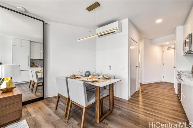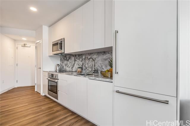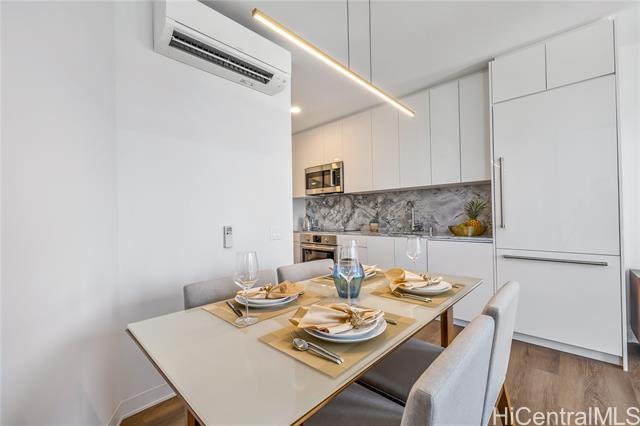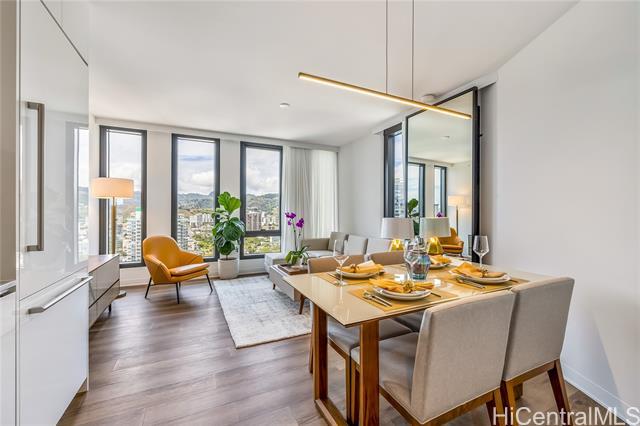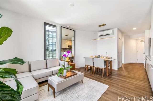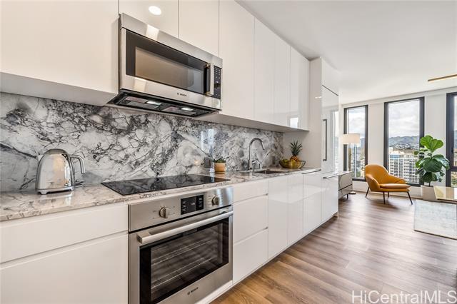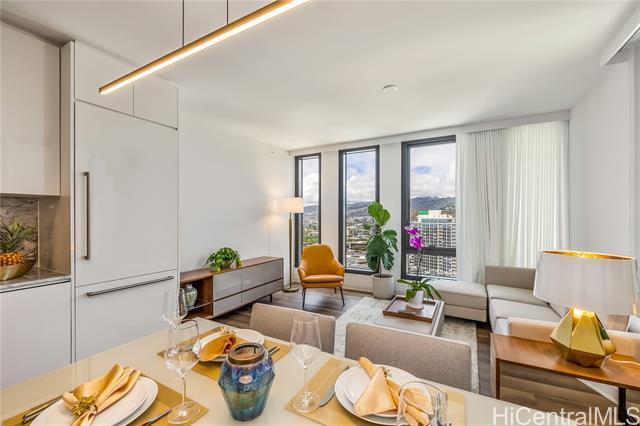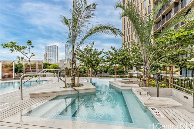 This gorgeous and immaculate high floor residence comes with more than $100,000 of upgrades including its own EV Outlet for the unit’s parking stall, specious Walk-in Storage Room (approx. 44 sq ft), two storage lockers all on level 6 conveniently located near the elevator, and Developer's original Turn-Key Package crafted by renowned interior designer Lauren Rottet at Rottet Studio! Enjoy cool breezes, panoramic mountains, and city views. The fresh vibrant interior features contemporary elegant finishes throughout. Natural stone countertops with full-height backsplashes, Bosch kitchen appliances, beautiful flooring in the living room and walk-in closet in the bedroom. Stylish amenities include a rooftop Sky deck with breathtaking ocean view, fitness center, Yoga room, resort style pools, jacuzzi, private cabanas, BBQ areas, indoor/outdoor lounge, dog park, children's play area and more. It is Pet friendly! Close to the Whole Foods market, restaurants, shops, parks, Kewalo boat harbor and Ala Moana Beach Park.