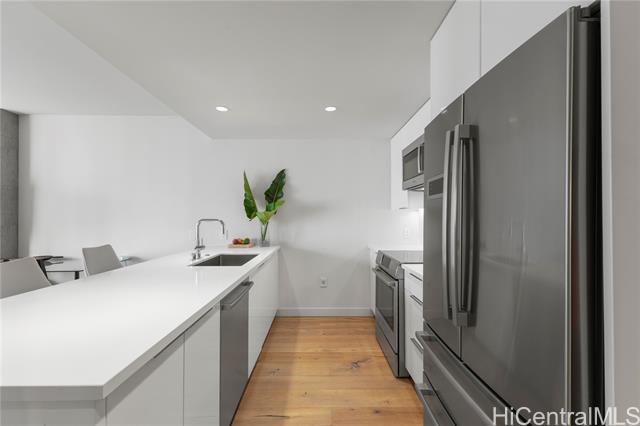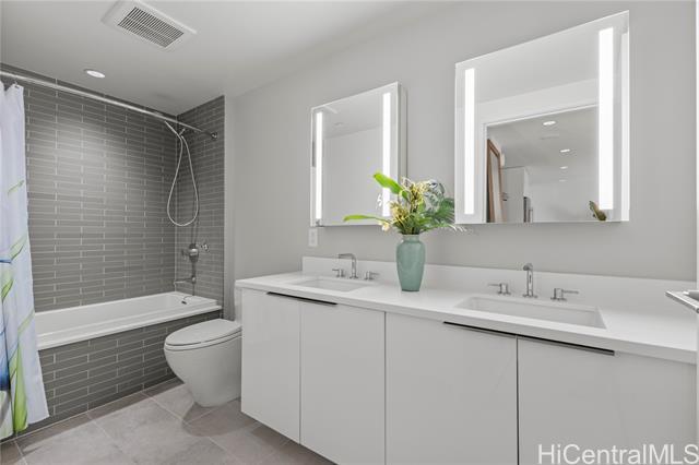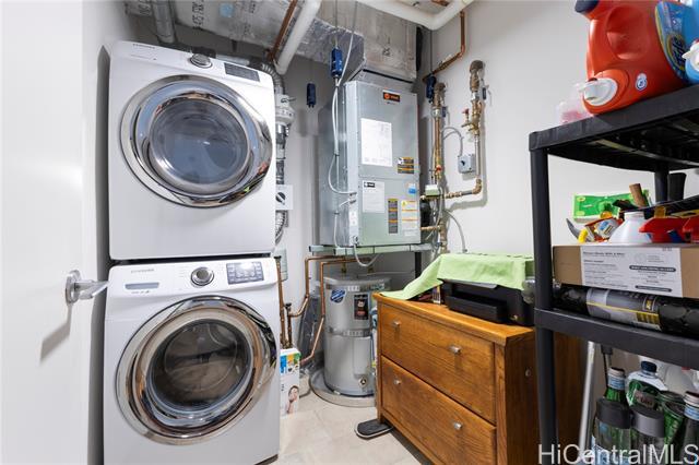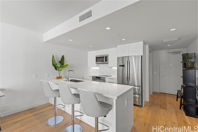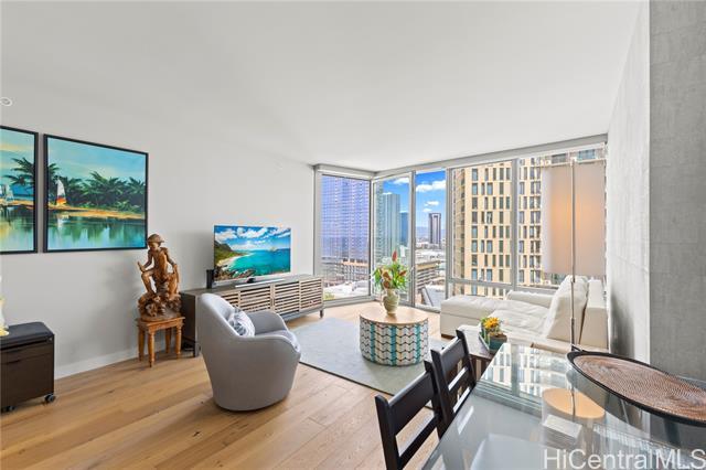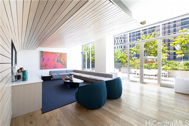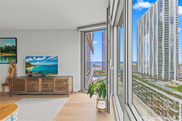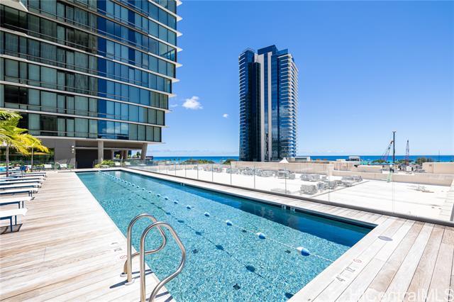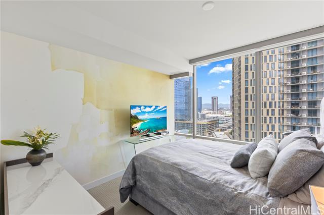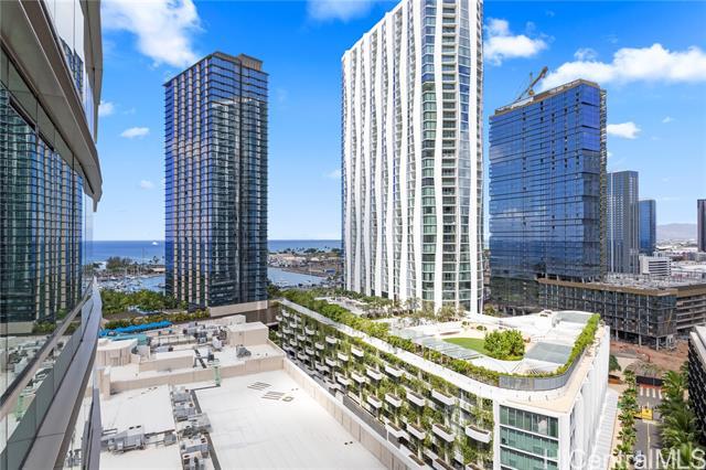 Back on the market - Excellent 1/1 home at Ae'o with ocean, harbor and mountain views! At 739sf, this is the largest 1/1 offered at the lowest price/sf. This must-see unit has premium Bosch stainless steel appliances, spacious bathroom with deep soaking tub, custom built-ins in kitchen and walk-in closet, engineered hardwood floors, floor-to-ceiling windows and bump out window/door for fresh air. Unit also comes with a full size W/D in the extra utility room and one parking stall with a separate storage unit. Resort-like amenities include a 24/7 hosted front desk, rooftop terrace, lap and family pool, fitness center, locker rooms with sauna and steam room, theater, play ground, guest suites, outdoor bbq, dining cabanas. This Ward Village condo features the best of urban lifestyle in paradise with direct access to Whole Foods market, numerous dining and entertainment options, beaches, shopping, Consolidated Theaters, Ala Moana Shopping Center all within a few blocks! Condo is pictured fully furnished for staging purposes only; it is currently vacant and easy to show. The information herein may contain inaccuracies and is provided without warranty or guaranty of any kind.