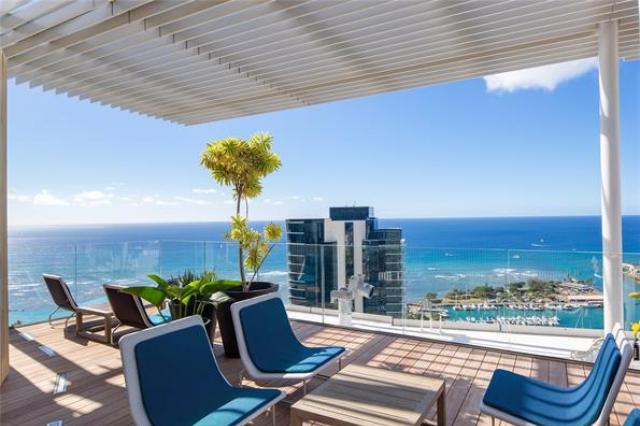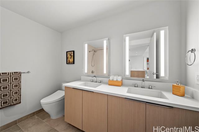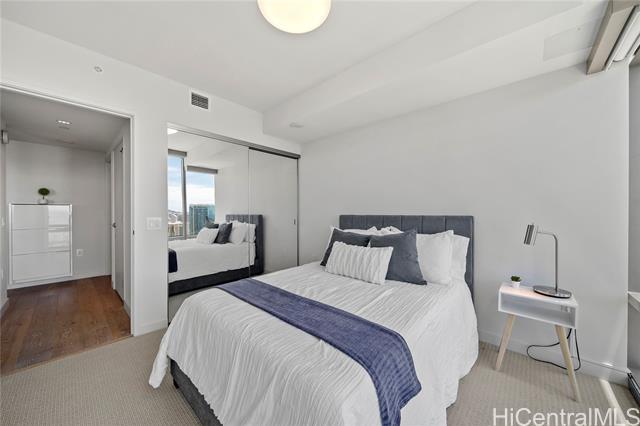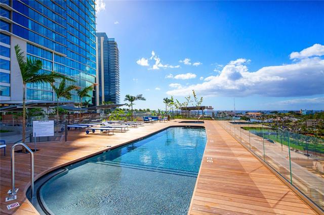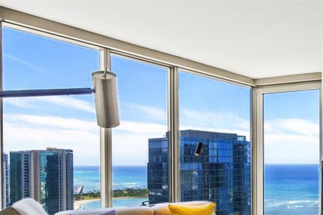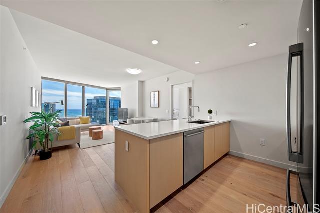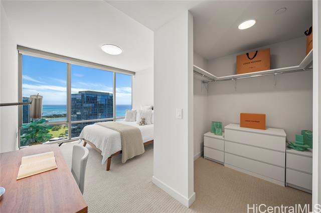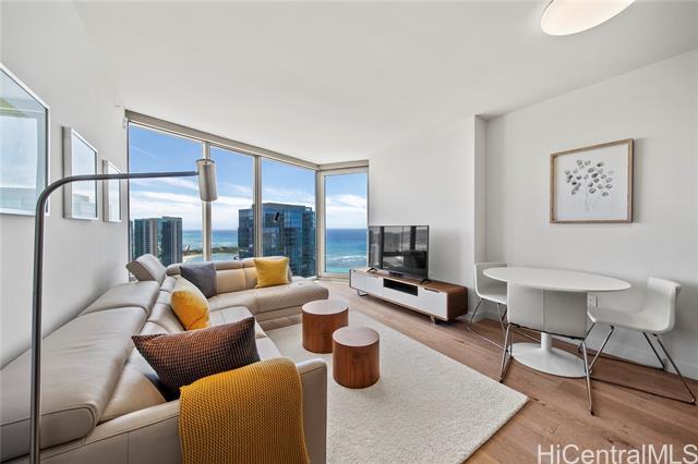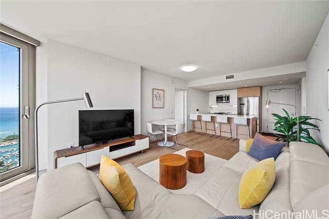 A preferred High Floor 2-bedroom, 2-bath Diamond Head side residence with 2 separate non-tandem Parking Stalls, one on the 3rd floor with a Personal Electric Vehicle (EV) Charger and nearby Deeded Storage, and one on the 5th floor. Outstanding coastline, ocean, and city views with a unique large operable “bump-out ”living room window perfectly angled to take advantage of the cooling Tradewinds. Desirable split-bedroom floor plan with motorized shades throughout. Light and bright engineered hardwood flooring, quality Studio Becker cabinetry, quartzite counter and vanity tops, stainless Bosch appliances, and Toto wash-lets and double sinks in both baths. Immaculately maintained in “Move In” condition. Abundant amenities include a large fitness center, separate heated lap and wading pools, whirlpool, sauna, steam-room, BBQ cabanas, party rooms, guest suites and more. Ae’o is ideally located in the highly coveted Kaka’ako Ward Village with direct access to the largest Whole Foods in Hawaii and walking distance to restaurants, the world class Ala Moana Shopping Mall and Ala Moana Beach Park.