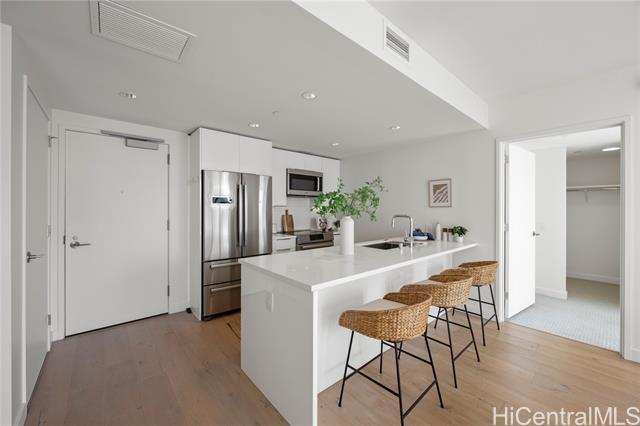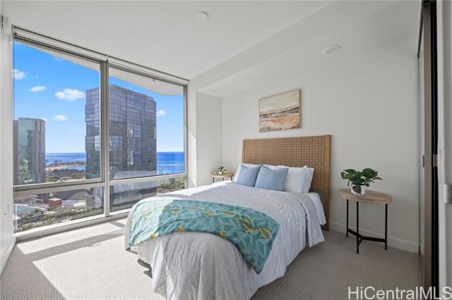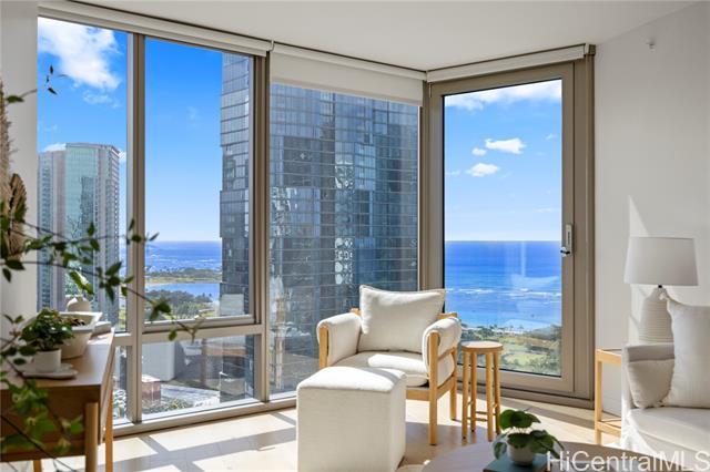 Splendid east-facing 2-bedroom, 2-bath, 2-parking unit at A‘eo in the award-winning Ward Village master planned neighborhood. Sweet spot in the building on the 24th floor and positioned for wide views of the ocean, Ala Moana beach park and beyond. Wet room style primary bath with separate shower and soaking tub. Parking is located on the 2nd floor for extra easy access to Whole Foods, plus a 4'x6' storage unit also on the 2nd floor, making this a best buy! Ae'o includes a rooftop deck, 2 swimming pools, hot tub, sauna and steam room, fitness center, media & dining rooms, guest suites, theater, dog park and more.