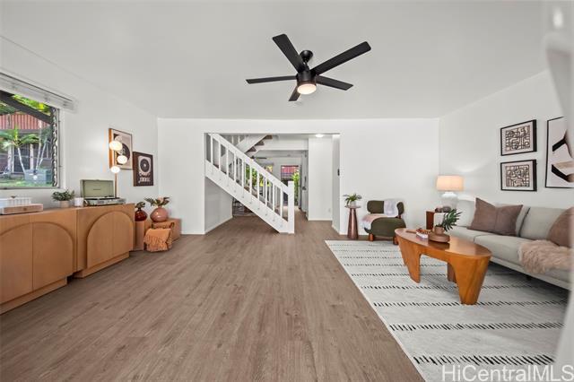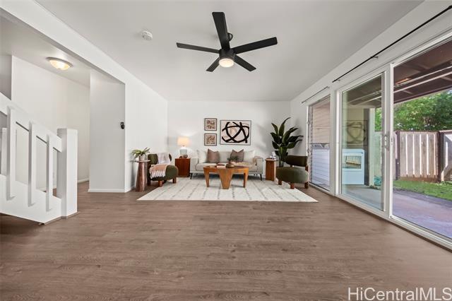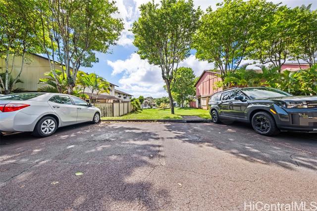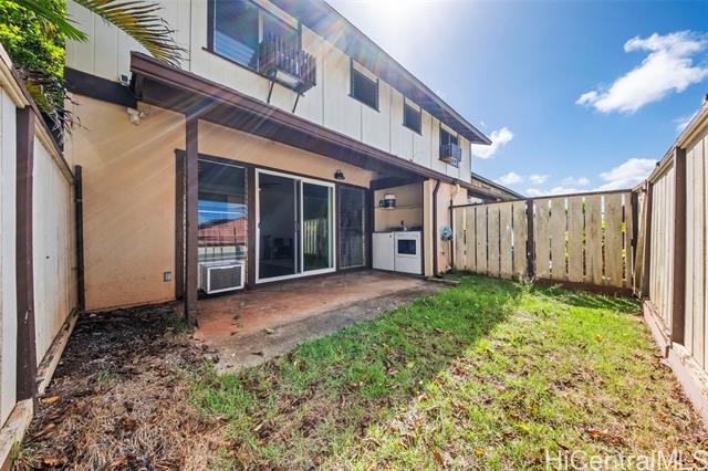 A cozy, clean, and contemporary oasis awaits you in Nob Hill! Tucked between vibrant greenery, the front door to this 3 bed, 2.5 bath unit opens to a beautifully welcoming dining area, just across from the kitchen. Lovely white cabinetry with black finishings are offset by lush garden views through the surrounding windows, making this a perfect place for any home chef to enjoy cooking and baking to their heart's content. Step through to the living room where sliding doors let in tons of natural light, and imagine the many ways you will be able to utilize the covered lanai just outside (outdoor gym, lounging area, or BBQ space -- you name it!). Walk up stairs to the sleeping quarters, complete with ample closet space and bathrooms with soaking tubs to ensure the utmost in rest and relaxation every night. Two parking stalls make multi-car family living a breeze, and Air Conditioning throughout guarantees comfortability even on hot summer days. Located just a few minutes drive from Mililani Town Center, MTA Rec Centers, Mililani High School, and Mililani Shopping Center - this is a unit not to be missed. Schedule a showing today!