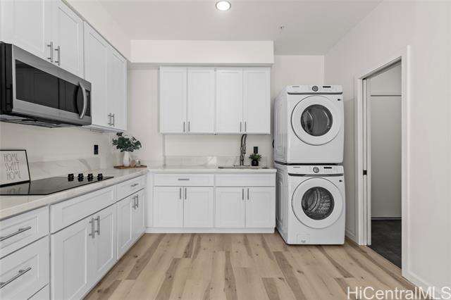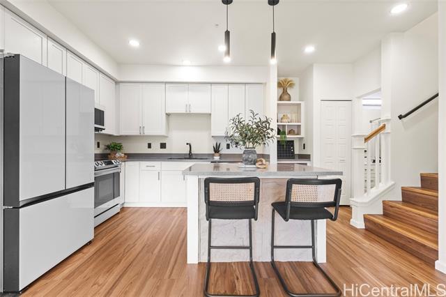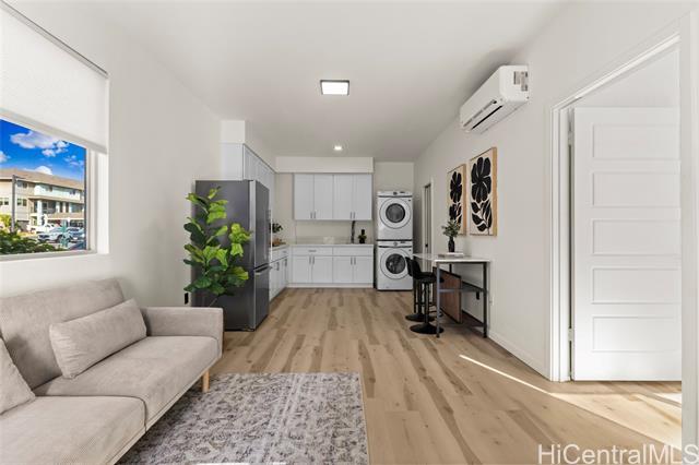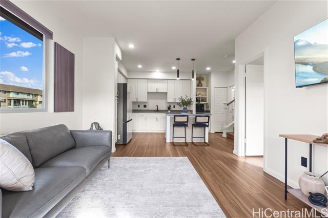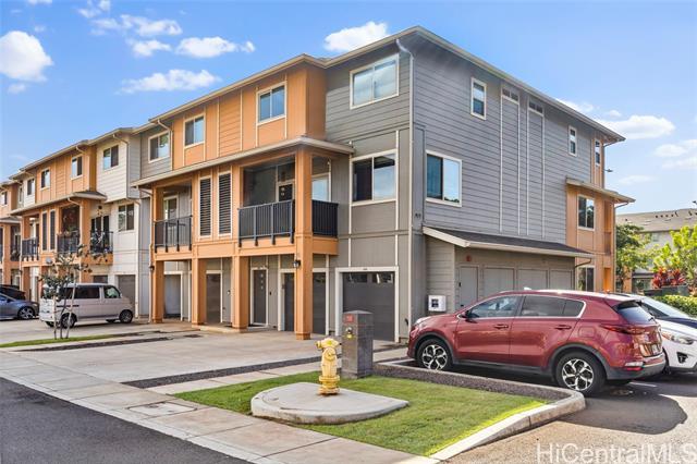 Welcome to Ho'opili & experience modern living in West Oahu’s most dynamic & fastest growing community. Discover this rarely available Kohina FLEX (Live-Work) townhome that boasts the largest 4/4 floor plan w/ an open-concept layout, high ceilings & large dual pane windows. This desirable corner-end unit is immaculate & move-in ready, featuring a well-equipped kitchen w/ island, drop zone, bookshelves & pantry. Sophisticated upgrades throughout showcasing LVP flooring, custom blinds, wall accents, lighting & fixtures. First floor offers 1 bedrm, 1 bath, full-size kitchenette, dedicated W/D & perfect for a home business, multi-gen living or rental opportunity. Prime location w/ spacious partitioned 2-car garage + extended driveway & close to guest stalls & loading zone. Live, work, & thrive at Ho‘opili w/ amenities at your doorstep & Festival Street + shops/business venues just around the corner. Enjoy rec center, pool, party venues, playgrounds & parks for sports, tots, & dogs. Near to Kapolei, Oahu's Second City, w/ an abundance of dining, shopping, entertainment, theaters, schools/universities, golf courses & more + easy access to freeway & rail. FIRST OPEN HOUSE, 10/26, 2-5PM.