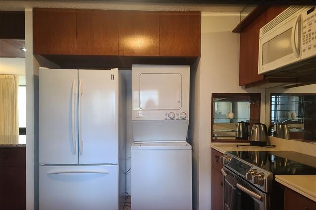 This unit boast phenomenal views of Diamond Head ocean and fireworks. These amazing views awaits you every day from this premier luxury residential building. Only 4 units per floor allows for your condo living a more quiet and private environment. This highly desired "C" stack unit with spacious 2 bedrooms and 2 private ensuite bathrooms welcomes your reality of living in paradise. The lanai has been enclosed for added living space. Beautiful custom built-in cabinets, bookshelves, and marble and wood parquet floors. Washer and dryer located in the unit. The building is pet friendly and has a pool, hot tub, BBQ, 24 hour security and a resident manager. Enjoy the convenience of living near boutiques, stores, renowned restaurants, and plenty of entertainment. The bus stop is located close by. The monthly maintenance fee covers ALL utilities including central AC, electricity, Cable TV, internet, hot/cold water.