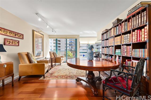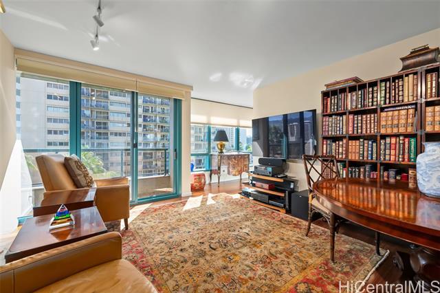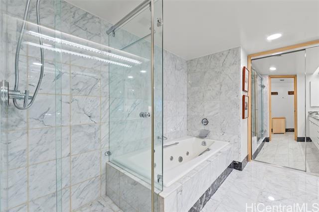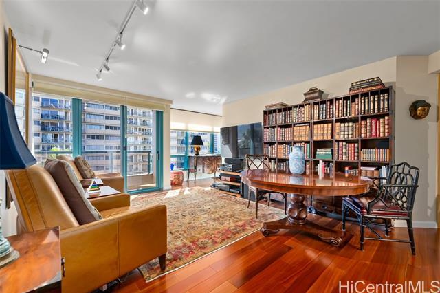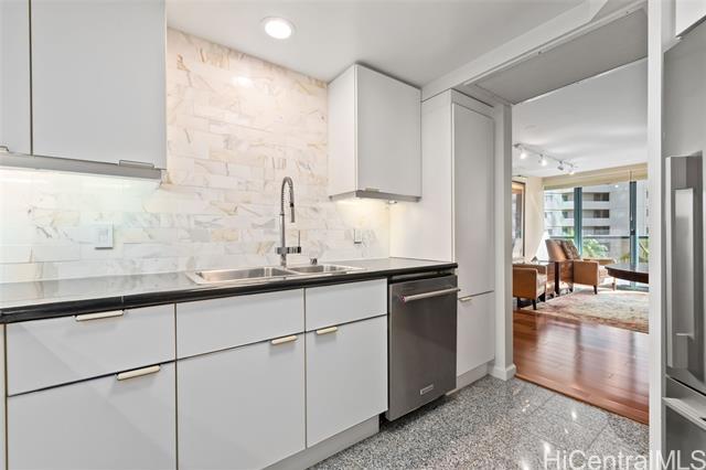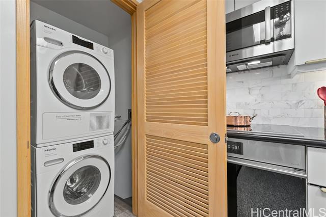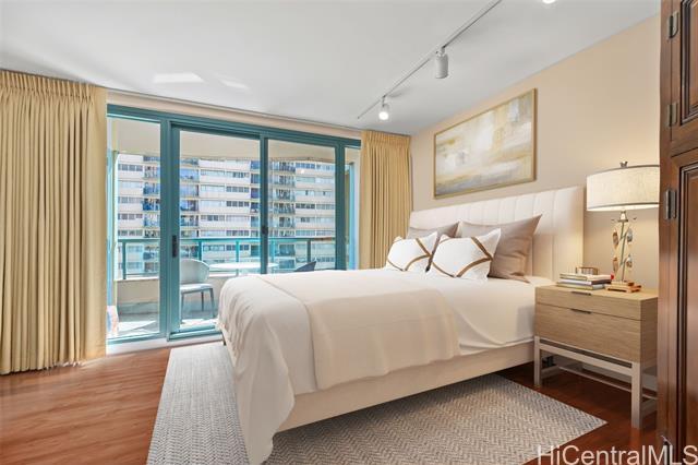Waikiki Landmark 907 combines thoughtful luxury upgrades w/ a warm sophisticated aesthetic. Rich hardwood floors guide you through a spacious open layout that feels both elegant & comfortable, creating an effortless flow from the foyer into the main living areas. Every detail has been refined for longevity style and ease of living. The kitchen features premium appliances including a GE Cafe wall oven, Miele cooktop, Paykel refrigerator, Bosch microwave, and stacked Miele washer & ventless dryer all complemented by a striking Calacatta marble backsplash. Energy efficient LED lighting & Energy Star appliances keep electricity costs low even with AC running. Bathrooms showcase restored marble surfaces, polished floors, refreshed countertops, and a newly regrouted master shower. New zoned AC systems in the living room and guest suite along with a rebuilt primary bedroom unit to ensure consistent cooling throughout. Designer touches include Hunter Douglas Duette shades, brass alabaster foyer sconces & refined LED track lighting. Residents enjoy the full suite of amenities, including a swimming pool, updated fitness center, 24 hour security, & guest parking. Schedule a showing today!