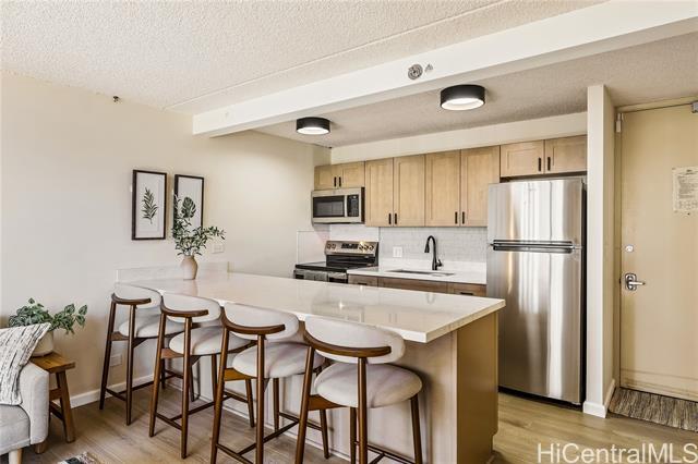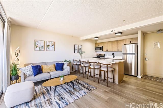 Legal Short-Term Rental with Parking and central A/C. Beautifully renovated and fully furnished 1-bedroom, 1-bath unit in the desirable Waikiki Sunset condominium. Modern finishes, open layout, central A/C and private lanai with peek-a-boo ocean views, city and mountain views. An unassigned parking stall is also included for ultimate convenience. Building amenities include swimming pool, sauna, fitness center, BBQ area and 24-hour security. Located in the heart of Waikiki, you’re a stone’s throw away from world-famous beaches, world-class dining, and endless shopping. Whether you want to surf at sunrise, dine under the stars, or generate income while you’re away, this Waikiki Sunset condo is the perfect blend of lifestyle and opportunity. Perfect as an investment or vacation home. Unit may be sold with all furniture, kitchen items and linens. See video walkthrough.
