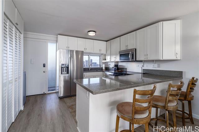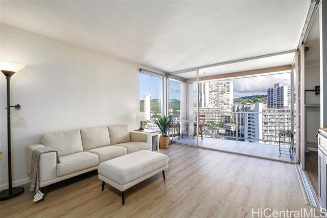 Town living at its finest from this high floor, premium “01” corner unit at Makiki Towers. This renovated 2-bedroom, 1.5 bathroom has all the modern upgrades: fully renovated in 2014 and upgraded with vinyl plank flooring, new paint, and popcorn ceiling removal in 2023. Enjoy cool breezes and beautiful mountain views from the lanai. Ready to move in with combined washer-dryer, covered parking, and additional storage locker. Award Winning Building and Management, Makiki Towers is a hidden gem with a pool, bbq areas, landscaped walking paths, and more. Walking distance to Punahou, Maryknoll, and a few minute drive to everything town has to offer.