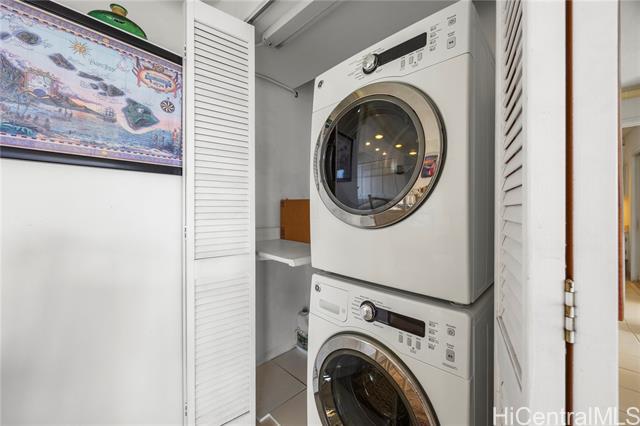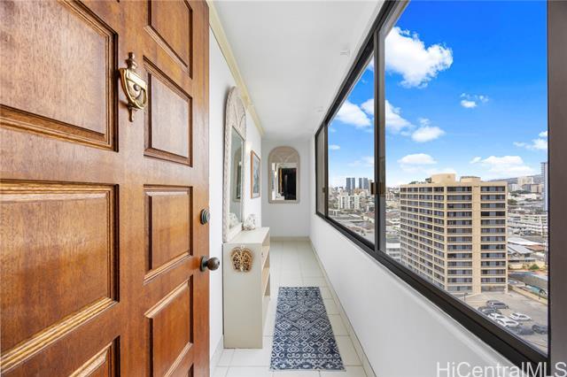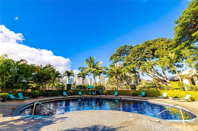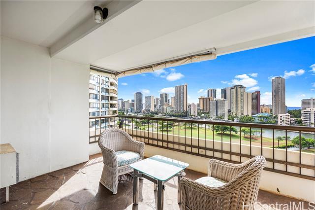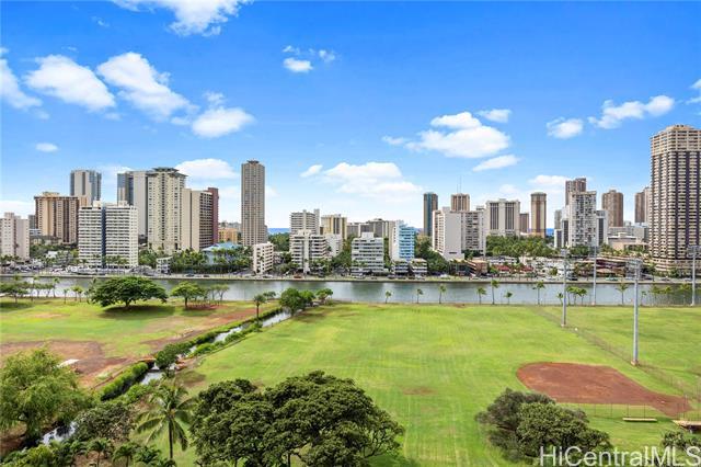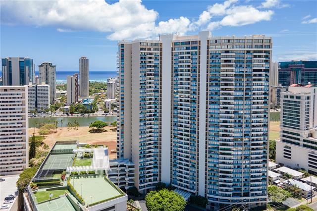 Beautiful city, Waikiki, marina, park and mountain views from this fee simple corner 2 bedroom/2 bathroom with covered parking. Watch the city lights from the spacious wrap around lanai, while enjoying the nice cross breeze. This unit features air conditioning in each room, and an in-unit washer/dryer. Excellent location on park setting with tropical grounds, close to famous Waikiki beaches, Ala Moana Shopping Center, restaurants and the University of Hawaii. The sprinkler/fire alarm system has been completed throughout the building without any special assessment. The Marco Polo offers resort-like amenities which include a wonderful large swimming pool, sauna, tennis, basketball/pickleball courts, BBQ, golf driving nets, a convenience store in the lobby, car wash area, bicycle/surfboard storage, lots of guest parking, storage, and 24 hour security.100% Hurricane Coverage with reasonable monthly maintenance fees. Photos have been Enhanced.