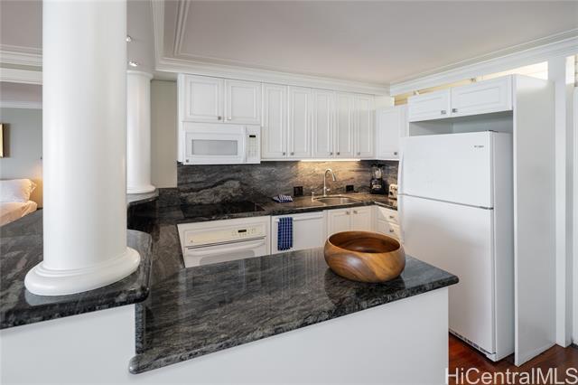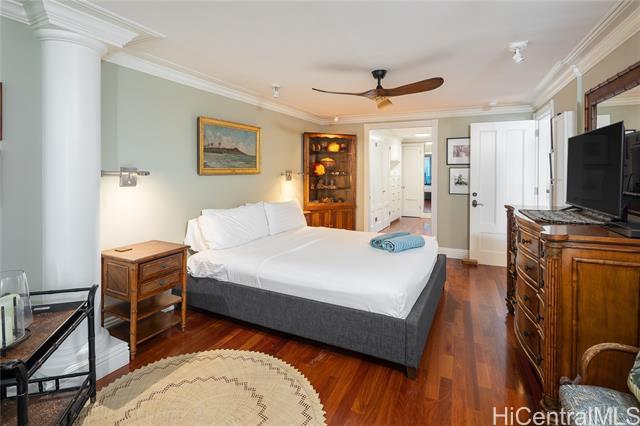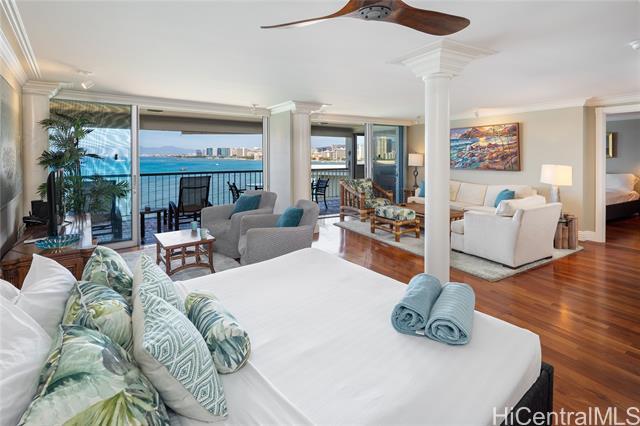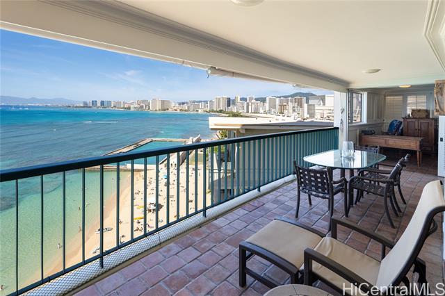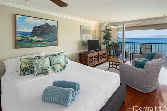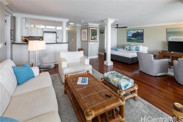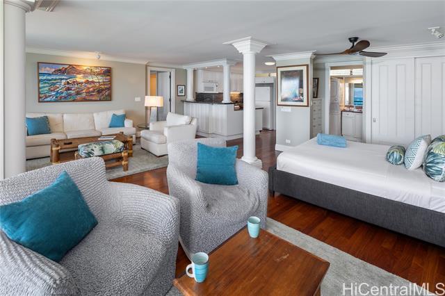 Available to view Saturday Feb 28 & Sunday March 1 - Experience classic Gold Coast living at Sans Souci. This wonderfully maintained high-floor residence enjoys a view plane that clears the Kaimana Beach Hotel, opening to ocean, palms, and cool tradewinds. The flexible layout lives like a spacious 1-bedroom, with an additional area perfect for guests, office, or a sleeping alcove. A smart opportunity for those who appreciate value - the LEASEHOLD structure allows you to keep more capital invested elsewhere, with the potential to generate income that helps offset monthly maintenance while still enjoying this unmatched lifestyle location. Currently rented with a 30-day minimum stay requirement. Rare option to purchase together with adjacent #1106 - studio (MLS# 202600209) to create a side-by-side family retreat or vacation getaway. Beloved oceanfront building steps to Kaimana Beach, Outrigger, Kapiolani Park, and Waikiki dining. A special offering combining location flexibility, and oceanfront living.