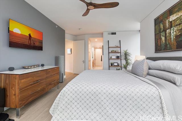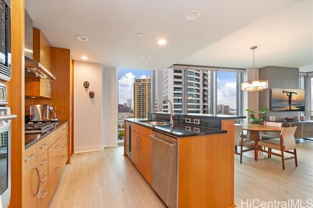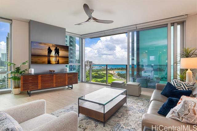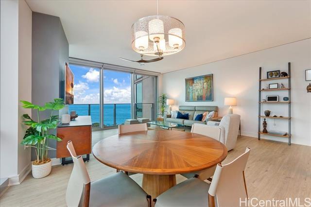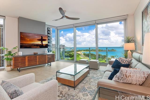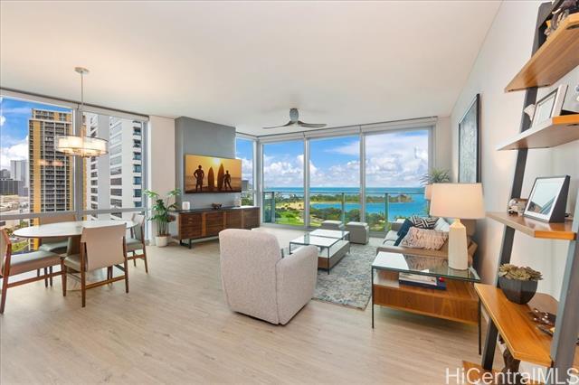 This highly sought-after Diamond Head–facing ocean corner residence is located on the 15th floor and offers one of the largest 2 bd floor plans in the building, approx. 1,620 sf. This desirable corner stack enjoys sweeping ocean and mountain views with no future construction obstructions, providing exceptional view protection and privacy. The prime location is ideal for enjoying weekly fireworks, the Honolulu Marathon starting point, parades, and other iconic island events. Impeccably maintained and in superb condition, the residence reflects true pride of ownership throughout. Over $150,000 in upgrades have been completed, including wood flooring throughout, new appliances, a new AC system, a new hot water tank, EV charger and electric window shades in all living areas except the second bedroom. Floor-to-ceiling sliding glass doors seamlessly connect indoor and outdoor living, inviting gentle trade winds and enhancing the open, airy island lifestyle. The unit layout is filled with natural light and offers an elegant yet comfortable living experience. Furniture is optional, valued at $85k. This is a rare offering that combines size, views, condition, and long-term value.