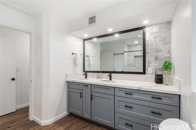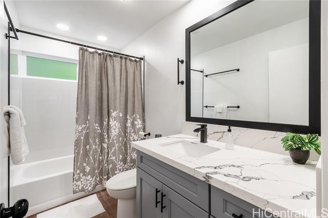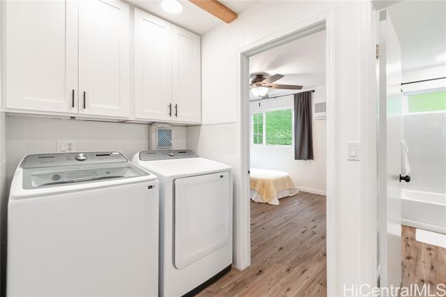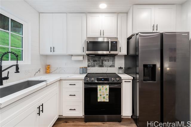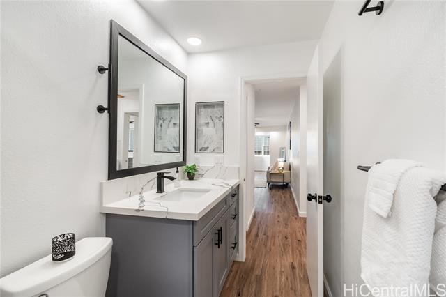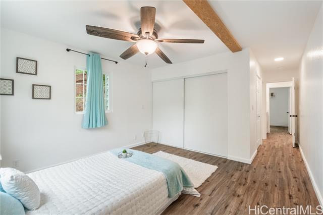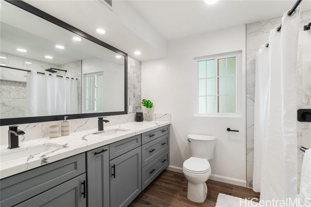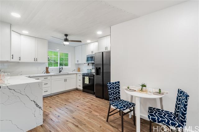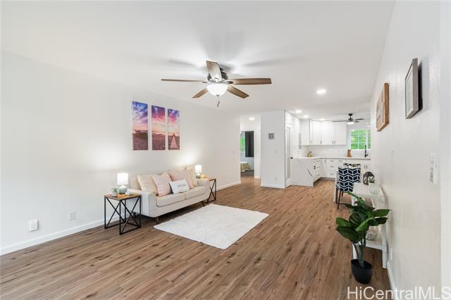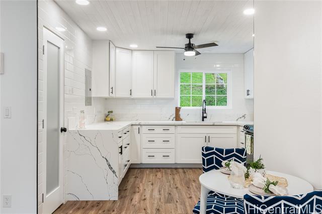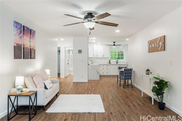 Completely remodeled and unlike anything else in Healani Gardens, this stunning corner/end unit has been thoughtfully reimagined from top to bottom. The heart of the home is a spacious, chef-inspired kitchen opened to the living area—featuring all-new cabinetry, sleek countertops with waterfall edges, tile backsplash, a large pantry, and brand-new appliances designed for both everyday living and entertaining. New luxury vinyl plank flooring flows throughout, complemented by fresh interior paint, updated bathrooms with new vanities and modern shower finishes, and new windows ( with warranty) help keep the cool air in and energy costs down. Healani Gardens is a pet-friendly community known for its convenience and Windward-side charm, with quick access to the H-3 freeway, Kaneohe, Kailua, shopping, dining, and outdoor recreation. Two parking stalls included (one covered, one uncovered) Both close to the unit. Move-in ready, beautifully upgraded, and truly one of a kind—this is your opportunity to own a fully renovated home in one of the most convenient locations on the Windward side. ***VA assumable loan for qualified buyers only! Details in agent remarks.***