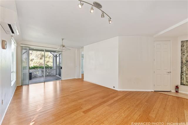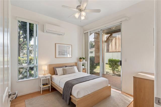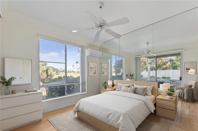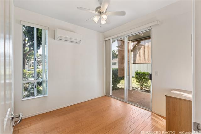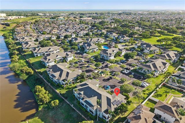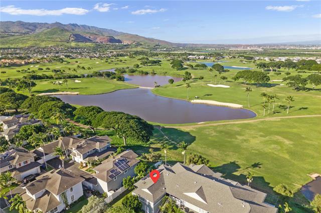 2 bedroom, 2 bathroom, 2 parking ground floor, single level corner/end unit facing Kapolei Golf Course with split A/C and PHOTOVOLTAIC PANELS! The only unit in Kekuilani Villas currently allowed to have PV panels, enjoy watching golfers while lounging in your cool living room knowing that your electricity bill will be a minimum. Prefer fresh air? No problem...cool breezes and ceiling fans are another option. For those who love to cook, this unit features a gas stove/oven. Bamboo hardwood floors, tile in bathrooms, solid wood "Kraftmaid" brand cabinets throughout, and a private layout with the bedrooms and bathrooms at opposite sides of the home. Includes two parking stalls just outside of your unit, and ample guest stalls for friends and relatives.