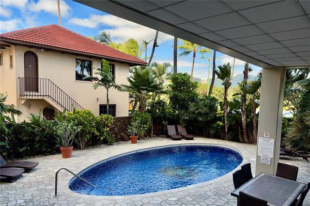 Very quiet and private building. Fairway Manor has only 4 units per floor. This high-floor home has a "peek-a-boo" ocean view and a huge open living room layout. It is a well-managed building in a great location. The unit includes a washer and dryer inside. It also comes with one assigned covered parking space. This is a pet-friendly building. Everything is a short distance away. Waikiki Beach is very close. The new Waikiki Market and Target are only blocks away for easy shopping. Enjoy the private pool and the peaceful environment. This unit is a clean slate ready for your personal touch. Excellent value in Waikiki. The unit is vacant, easy to show with a lock box, and parking #38 is available for you.