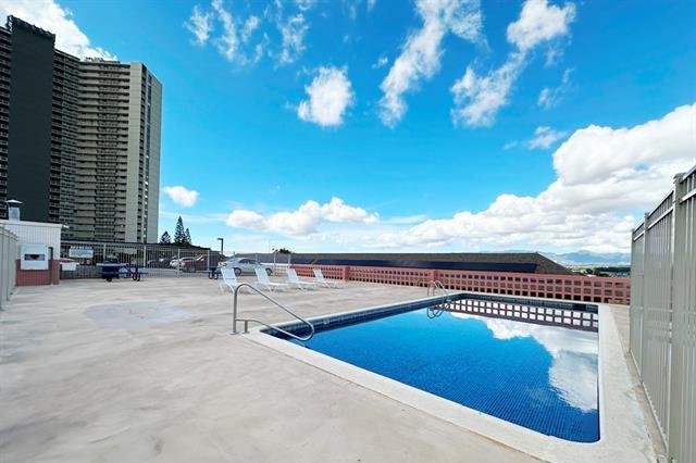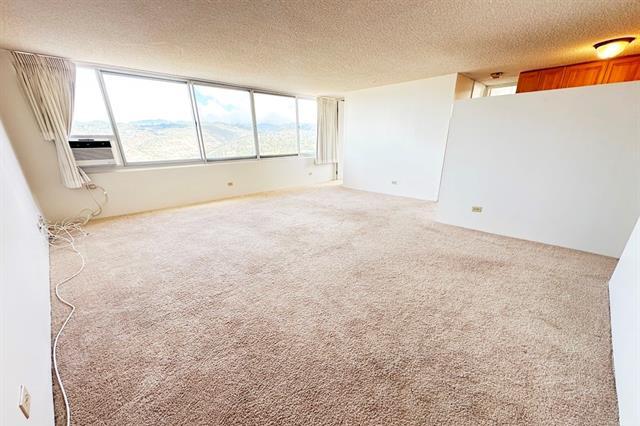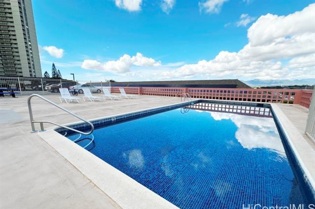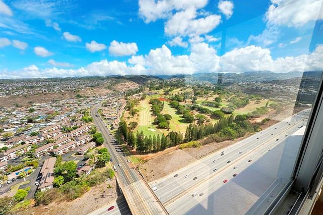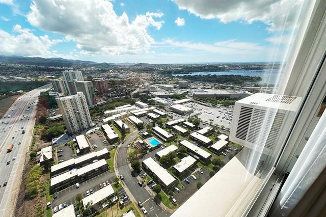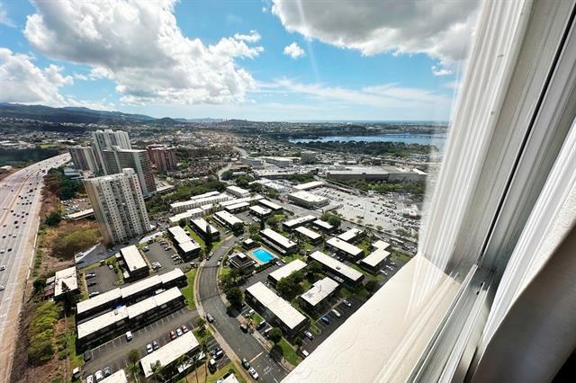 Perched on the 39th floor of Pearlridge Square, this rarely available 2-bedroom, 2-bath residence with 2 covered, assigned parking stalls offers elevated living with sweeping Pearl at Kalauao Golf Course views. One of only four units on the floor, this high-floor home delivers privacy, cool breezes, and a serene atmosphere above it all. Interior features include window A/C units, a stacked washer and dryer, wall-to-wall carpeting, and drapes for move-in comfort. Residents enjoy a full suite of amenities including an on-site resident manager, security guard, landscaping team, BBQ area, community association pool, exercise room, recreation area, sauna, trash chute, and multiple guest parking stalls. Ideally located just over a quarter mile from Pearlridge Mall, with convenient access to shopping, dining, and entertainment throughout Pearlridge Center. Close to Pali Momi Medical Center, Down to Earth, and offering easy freeway access to Pearl Harbor, Hickam AFB, and beyond. All showings are by private appointment only.