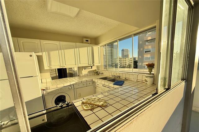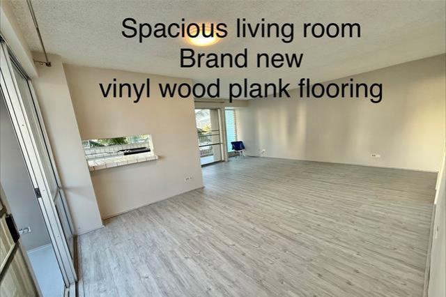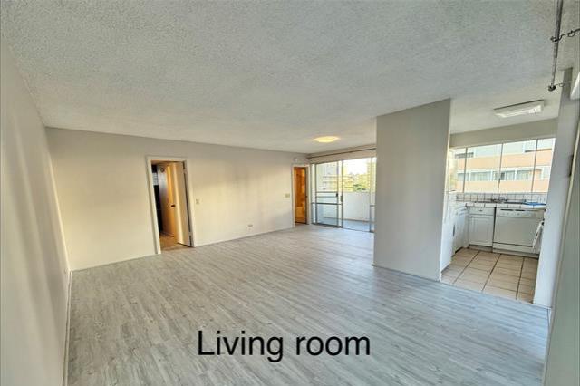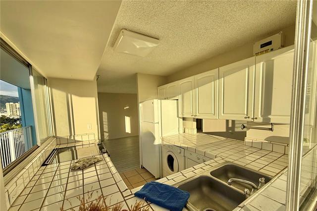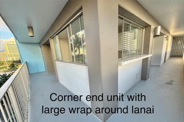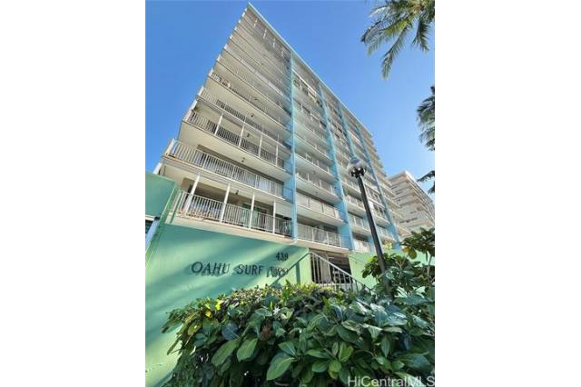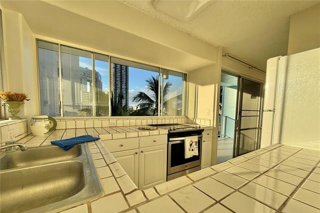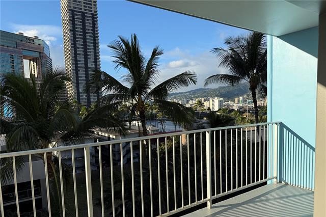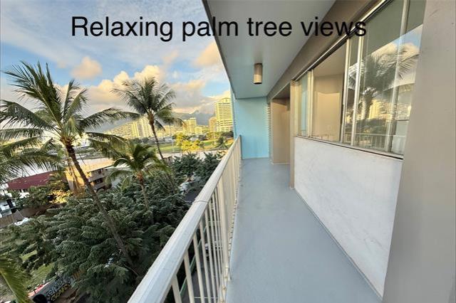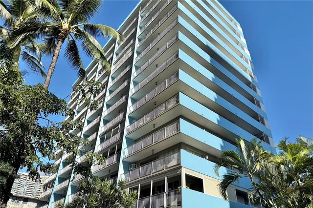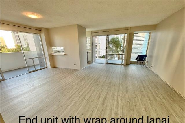 Quiet side street between Ala Wai Blvd & Kuhio Ave on the Ewa end of Waikiki. Relax & enjoy the palm tree views from the LARGE 316 sq.ft. wrap around lanai. Corner unit features NEW vinyl wood PLANK flooring, fresh paint, & one assigned covered parking stall #12. Bright & airy kitchen with lots of windows. Washer & dryer conveniently located in the unit.