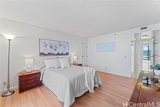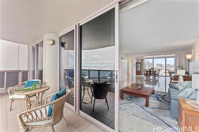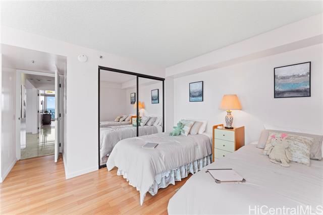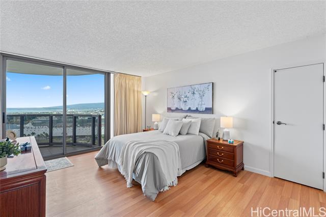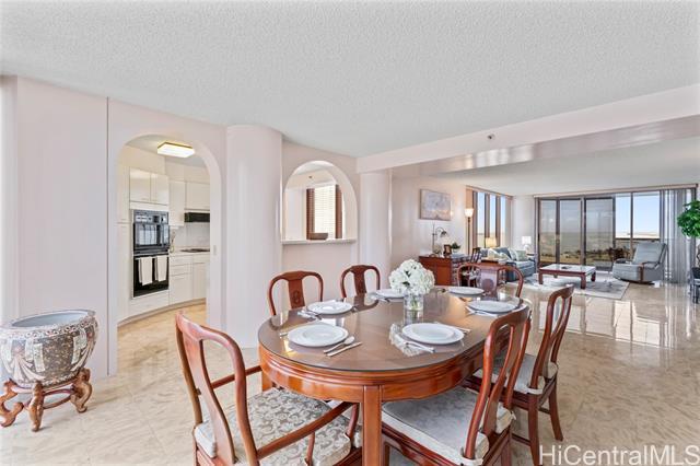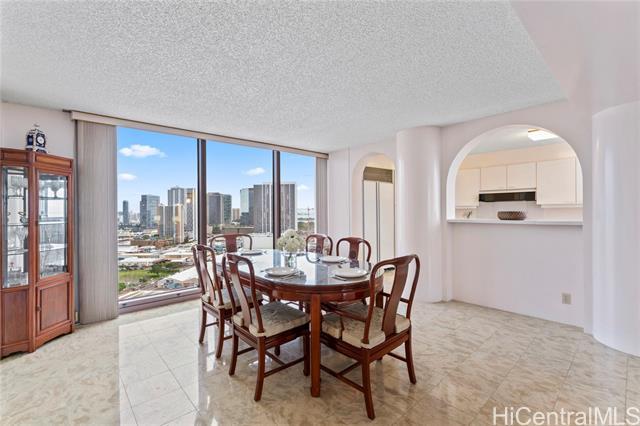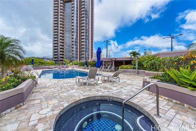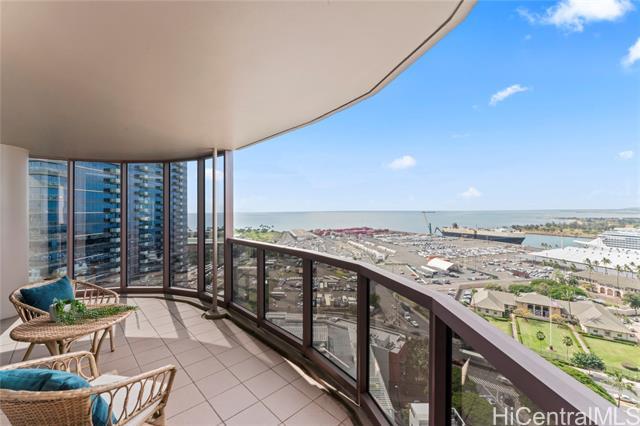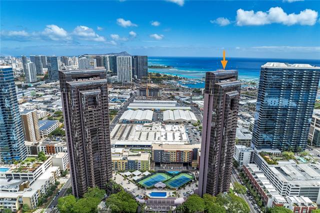 Sweeping ocean, mountain and city views from this 24th floor unit. Gorgeous, cool stone flooring throughout. This is your opportunity to live in the heart of Kakaako at a well established building. Restaurants, grocery stores, coffee shops, gyms, salons, and boutique shopping just outside your door! Building and unit equipped with fire sprinklers. Central AC, cable, internet and Washer/Dryer hook ups in unit. This two bedroom, two bathroom unit with two parking spaces has been lovingly cared for. Furniture negotiable. School zones obtained from Hawaii DOE school finder website. Buyer to verify. Monthly maintenance fee: $2051, Special Assessment: $114, Loan Assessment: $168 Electricity billed at special rate with maintenance fee: Varies but approximately $300 per month