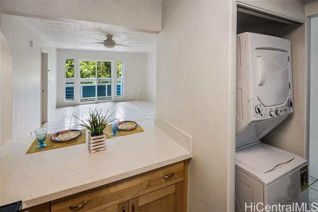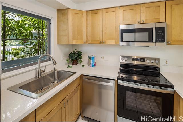 Enjoy peaceful treetop views from this charming light-filled 2-bedroom, 2-bath home, ideally situated with no unit below for added privacy. The open living and dining area flows seamlessly to a covered lanai, perfect for morning coffee or evening relaxation surrounded by greenery. Brand new stainless steel kitchen appliances, sink and countertops make the kitchen a dream to work in. Arched doorways and countertop seating add to the charm. Fresh paint, new light fixtures, and newer windows enhance natural light and comfort throughout. Bathrooms have new sinks, countertops, and fixtures. Located in a desirable corner building within the complex, this residence offers a serene setting while remaining conveniently close to shopping, dining, Kailua beach, and everyday essentials. Gardens, playground, gazebo and park like setting make this property enjoyable everyday.