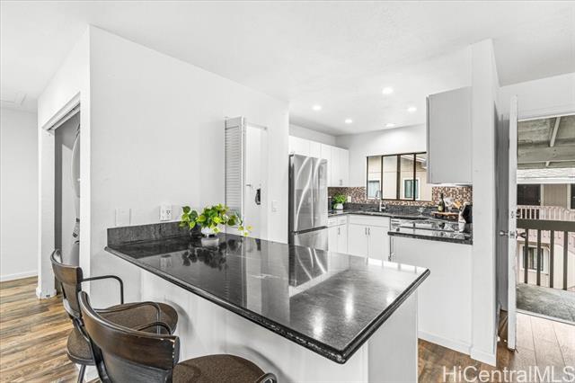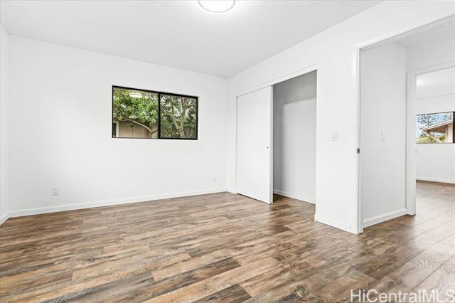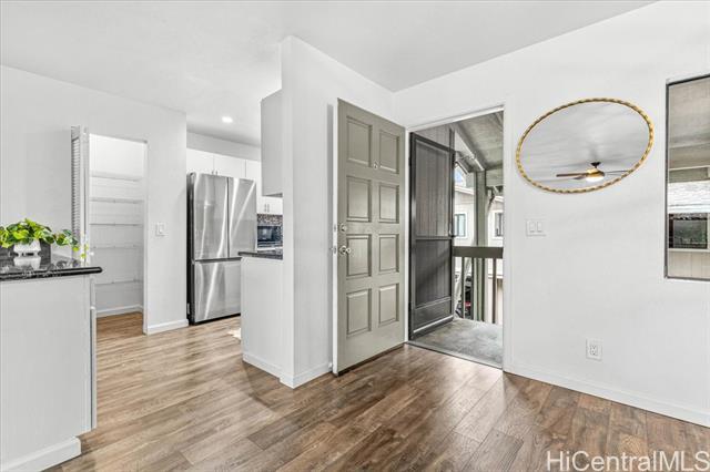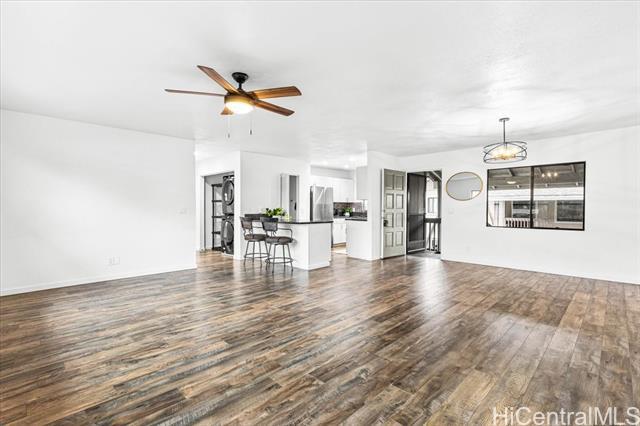 Beautifully renovated upper floor townhome has generously sized spaces throughout! 2 bedrooms, 2 full baths (en-suite in the primary and a hall bath with tub), an open and breezy living area (large sectionals welcome!), and 2 parking stalls (1 covered and 1 open). Tucked away in a back row building, it features an eat-in kitchen island, large pantry, and enough space at the entry for a dining table. Features stacked and full sized washer/dryer in the hallway closet, laminate flooring, and timeless granite countertops with white cabinets. Perfect for those that want a highly coveted starter home or investment property with ample storage and parking for residents and guests. Excellent proximity to Mililani Shopping Center's plethora of restaurants, shops, and services; public and private schools; a park with baseball field, basketball, pickleball and tennis courts; conveniently located bus stops; and Rec 1 being the closest of seven rec centers for Mililani residents to enjoy. Easy on and off Kamehameha Hwy and nearby H-2 Freeway for commuters too! Come and see how you and yours can keep the Year of the Horse going right in your new Mililani home today!