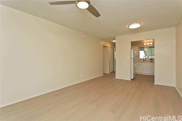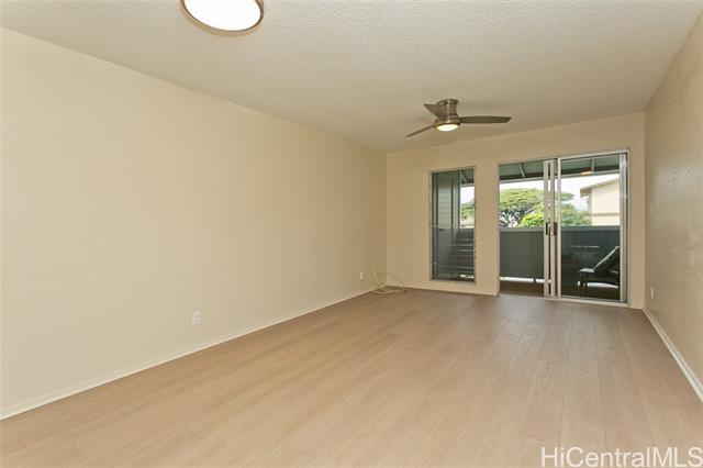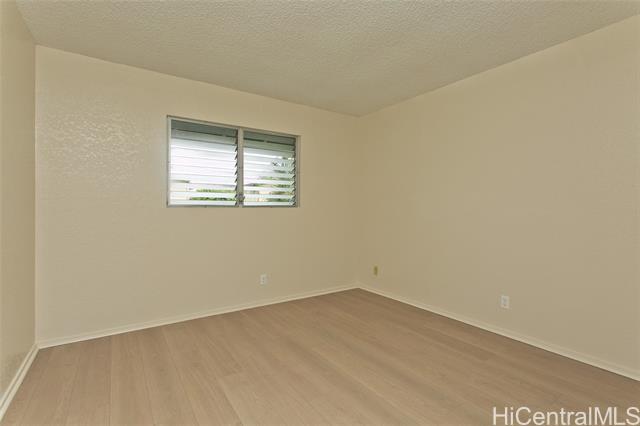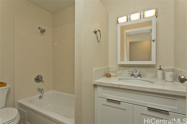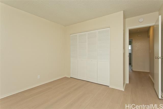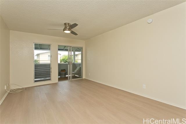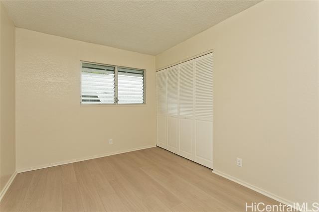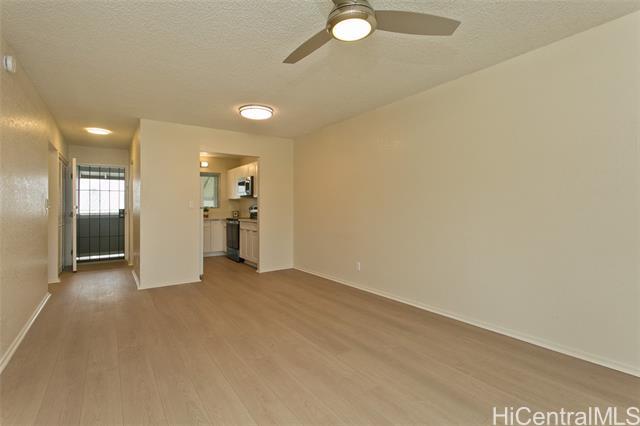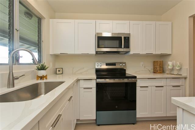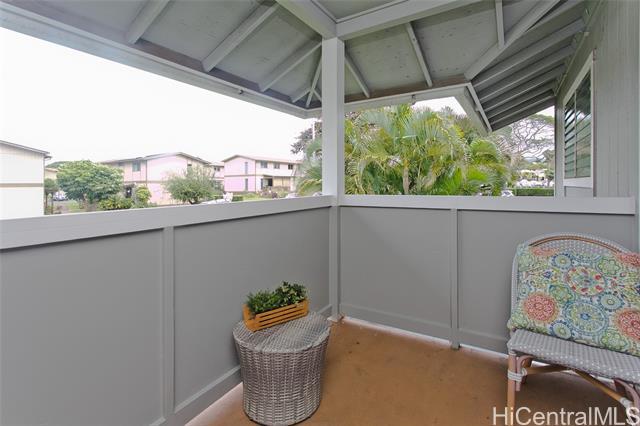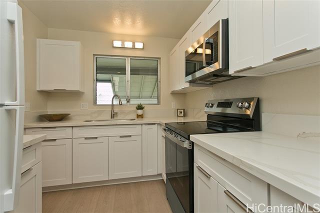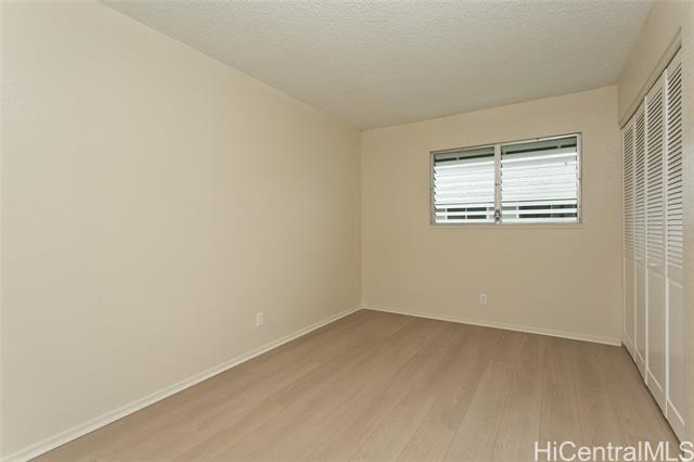 This turn key unit is ready to move in! Fully renovated 2 bedroom 1 bath on the second floor. The kitchen has been tastefully upgraded with new kitchen, quartz counters, stainless steel sink, fixture, microwave hood, range/stove. All new vinyl planks, fully painted with modern neutral colors. The bathroom has been upgraded with new quartz vanity, toilet, cultural marble shower walls. Bathtub refinished. New water heater. Electrical and Plumbing upgraded. New light fixtures, ceiling fan in living room. Full size washer dryer in between the two bedrooms. Nice size lanai that has been painted along with storage closet. Ample street parking. Close to Waiau Elementary School. Quiet unit away from the main streets. Conveniently located in Pearl City to Shopping Malls, Restaurants, Freeway Access. Lanai Flooring - to be changed by Association. Waiting on ETA. Please schedule showings through Sentrikey. No guest parking. Please park on the street.