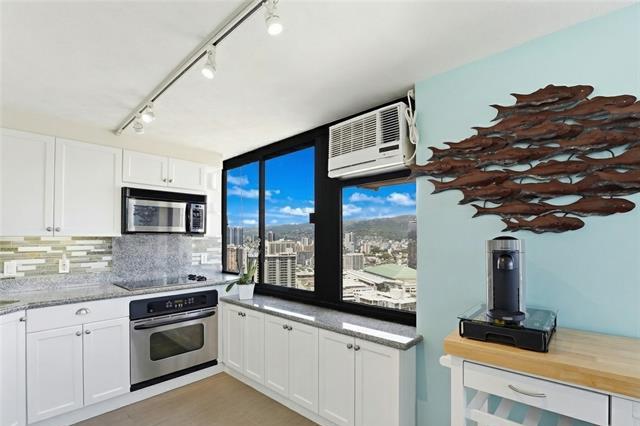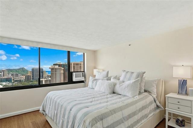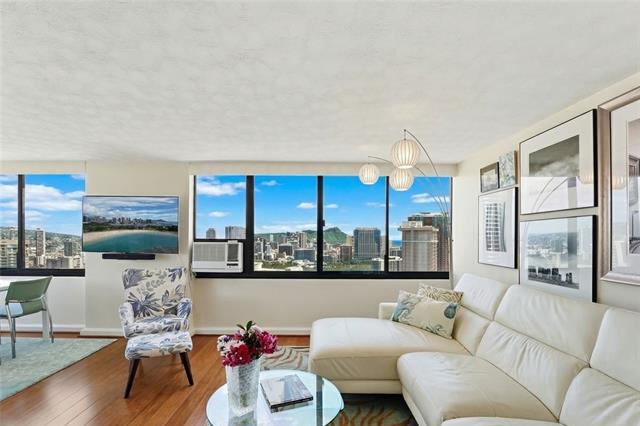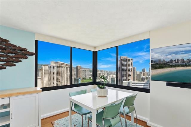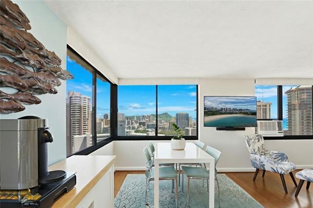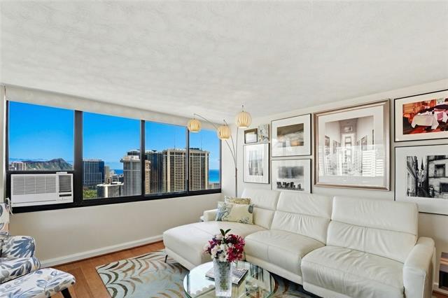 Welcome Home to The Windsor! Enjoy stunning Diamond Head/Ocean Views from your very own 2 bed x 2 bath, corner/end unit in the highly desirable “02” stack. This high floor residence captures cool trade winds and ideal morning sunlight, creating a bright + modern living space. Spacious Kitchen is fully equipped with a new refrigerator, faucet, and garbage disposal; along with a dishwasher, microwave, glass-top stove, and slide-out cabinetry offering generous counter space. Meticulously maintained and sold fully furnished, this home is truly move-in ready. Spacious master bdrm features a walk-in closet with built-ins, A/C, and an ensuite with dual sinks. Unit also features: in-unit washer/dryer, ample storage, and split bamboo flooring. The Windsor is a pet-friendly building with only four units per floor. Residents enjoy added peace of mind w/ fire sprinklers and 24-hour security. Resort-style amenities include a panoramic Sky Terrace with breathtaking 360° views, heated pool, jacuzzi, gym, yoga room, BBQ, storage, putting green, EV charging, and guest parking! Just minutes from Ala Moana Center, beaches, parks, and casual/fine dining, this is truly island living at its finest!