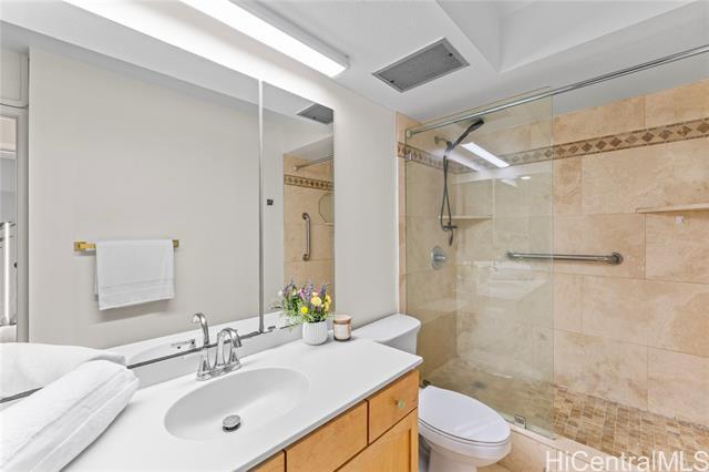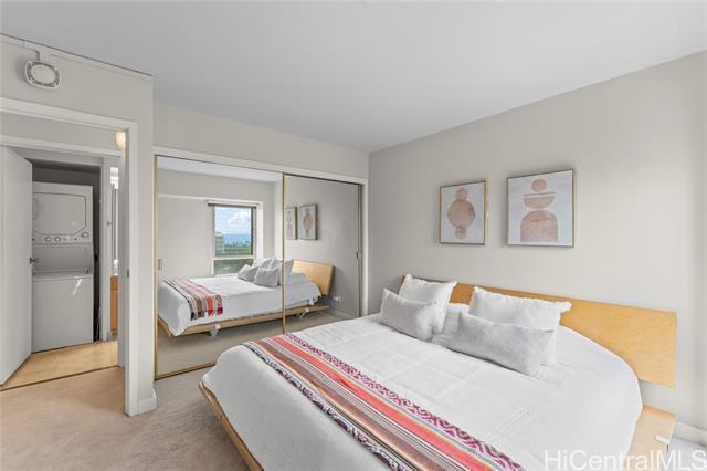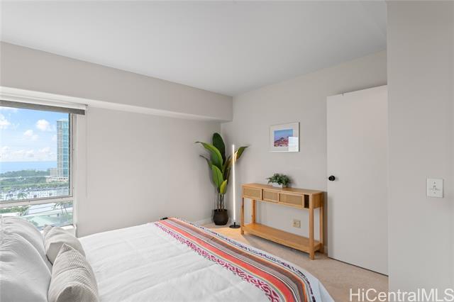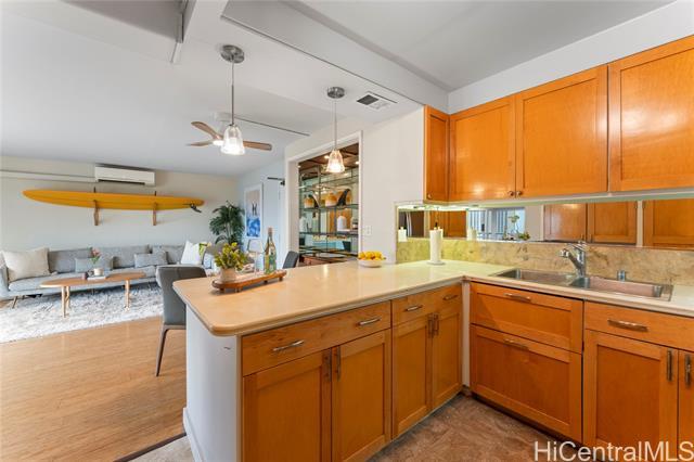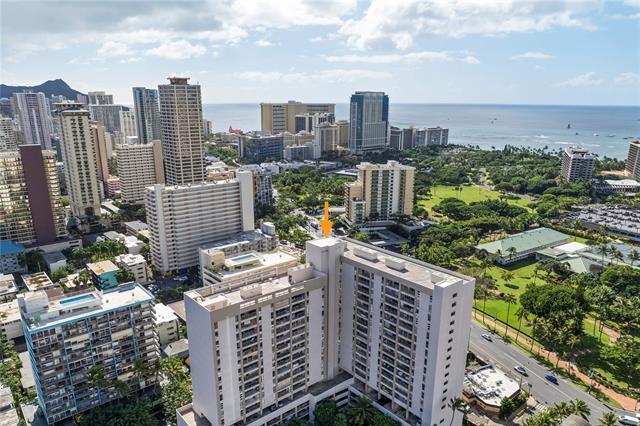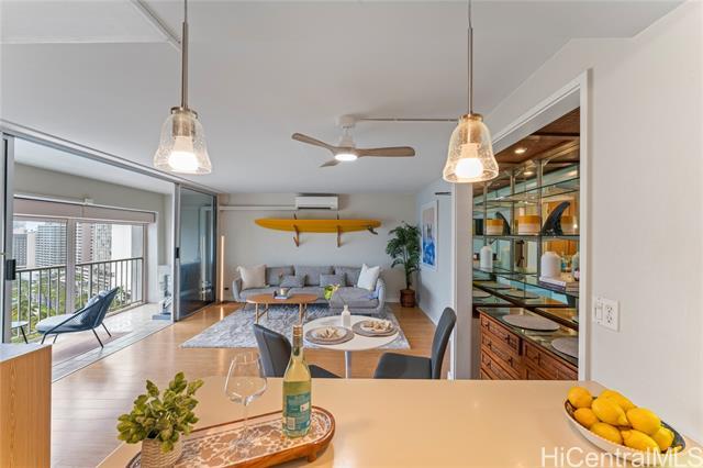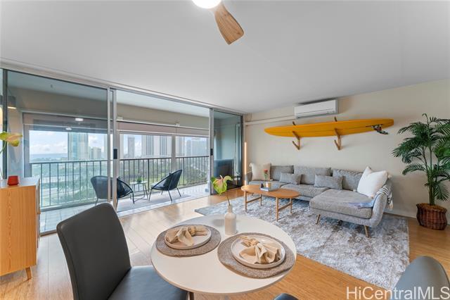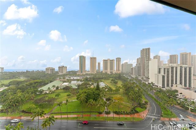 Enjoy spectacular ocean views from this beautifully remodeled high-floor 2-bedroom, 1.5-bath residence at Keoni Ana. This spacious unit features an open floor plan, a bright and well-designed kitchen, split A/C, in-unit washer and dryer, ample closet space, and an assigned covered parking stall. The lanai stretches along the living area, providing the perfect place to relax and take in breathtaking ocean and Waikiki sunset views. Motorized shutters offer added convenience and peace of mind, making it easy to lock up and travel. Keoni Ana is a well-managed, secure building in a prime Waikiki location, with major improvements already completed, including: elevator modernization and plumbing upgrades. Amenities include 24-hour security, guest parking, BBQ areas, and a rooftop walking/jogging path with panoramic ocean and mountain views. Ideally located near Waikiki Beach, Ala Moana, world-class dining, shopping, entertainment, and the marina, this is an exceptional opportunity to enjoy the best of island living in the heart of Waikiki. First Open House 4/12 from 2 pm to 5 pm.