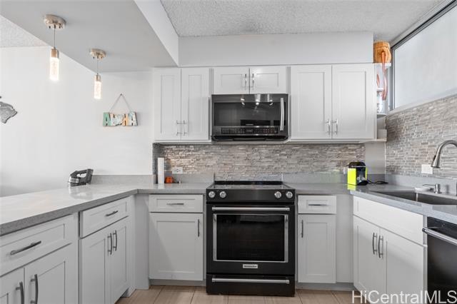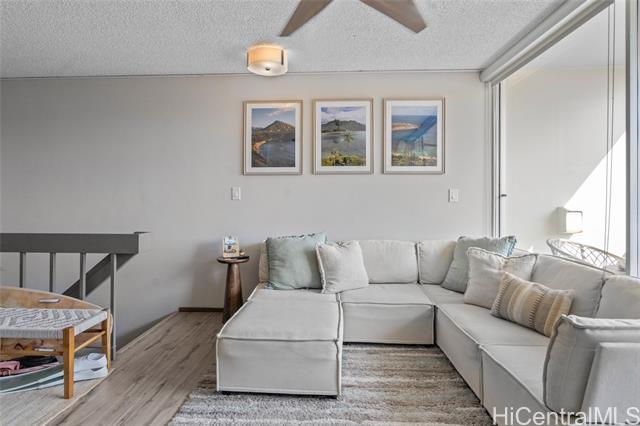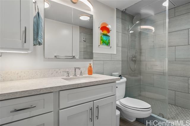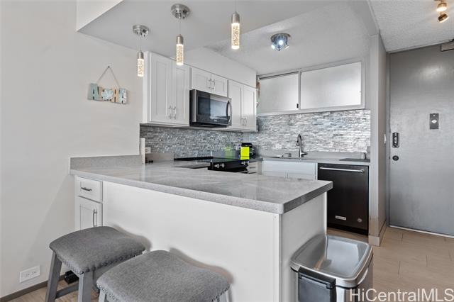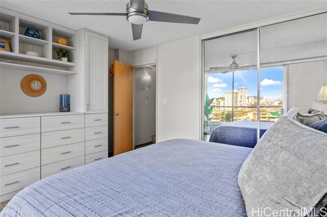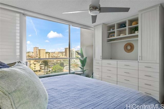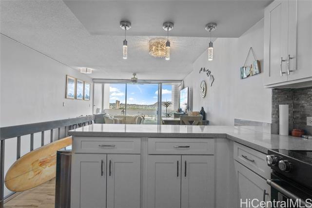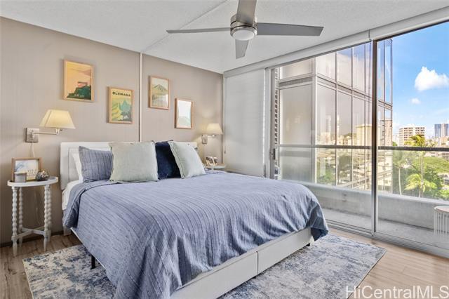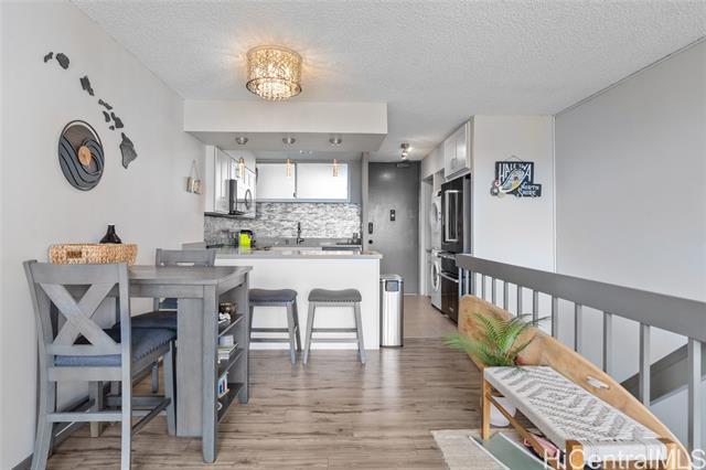 Experience the ultimate comfort in your newly renovated split-level home featuring lanais on both levels, offering breathtaking views of Diamond Head that span from the lush mountains to the vibrant cityscape. The thoughtfully designed floor plan boasts a spacious living room and kitchen on the main entry level, with the bedroom located on the lower level for added privacy. Recent renovations include luxurious LVP flooring, a fully modernized kitchen complete with a dishwasher, range, refrigerator, quartz countertops, and in-unit washer and dryer. The sleek bathroom and updated plumbing fixtures throughout (including kitchen, bath, shower, toilet, and shutoff valves) ensure modern convenience, complemented by an upgraded electrical panel and custom closet shelving. Ala Wai Skyrise is a secure, well-maintained building that offers amenities such as guest parking, a pool, BBQ area, and an on-site manager. Perfectly positioned near the bus line, University of Hawaii, Iolani School, and other educational institutions, it provides.