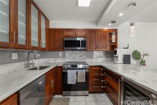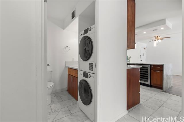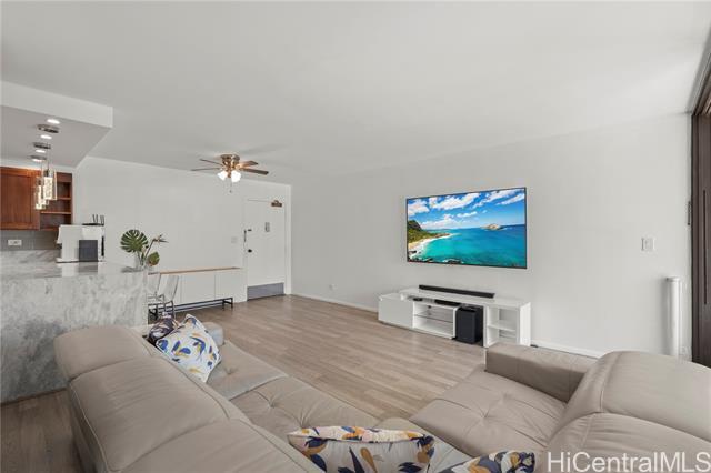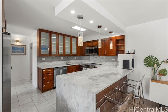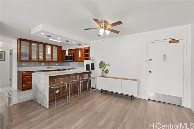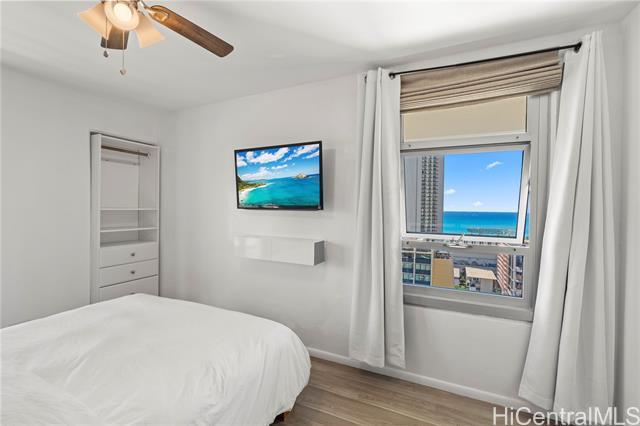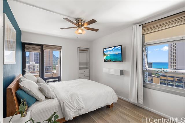 The beach is calling from this stunning, turnkey 2-bedroom penthouse retreat in the heart of Waikiki! Meticulously renovated, this 830 sq. ft. home at the Governor Cleghorn offers breathtaking views of the turquoise Pacific Ocean, Koolau mountains, and a peek-a-boo view of iconic Diamond Head. The interior features a gourmet kitchen with custom cabinetry, stainless steel appliances, and a wine refrigerator. Unwind in your expansive primary suite, complete with a walk-in closet and a spa-inspired bath. Enjoy seamless indoor-outdoor living on your spacious private lanai with custom benches, perfect for sunset cocktails and cool trade winds. Modern conveniences include an in-unit washer/dryer, A/C, a storage room in the lanai, and a highly desirable ground-level parking stall located just steps from the secure keyed elevator. The building features a resident manager and a refreshing swimming pool for entertaining friends and family. Perfectly positioned two blocks from world-famous Waikiki beaches and steps from the International Market Place, this is your opportunity to live where every day feels like a vacation!