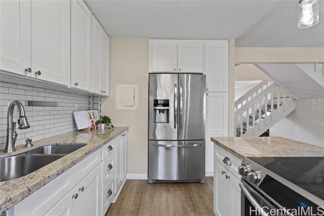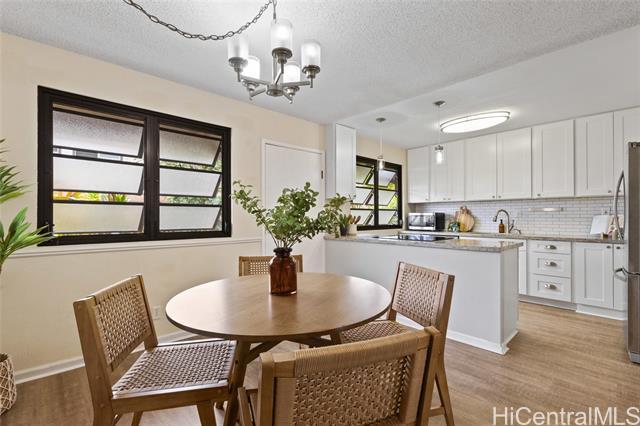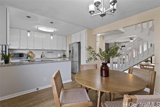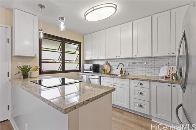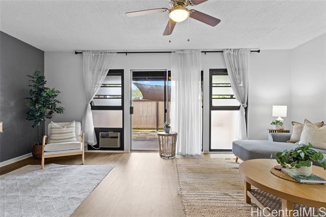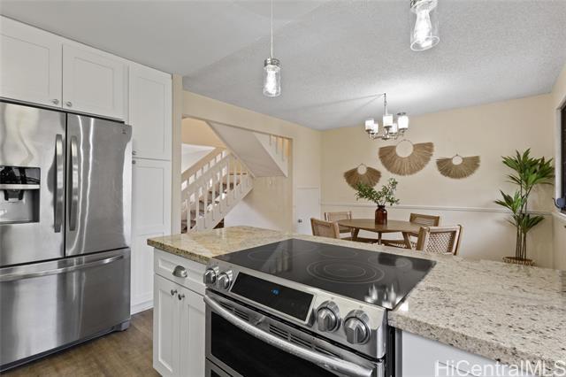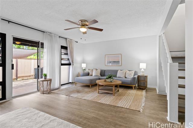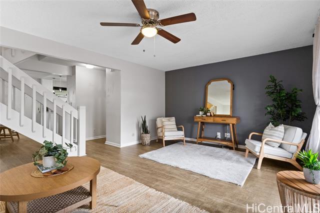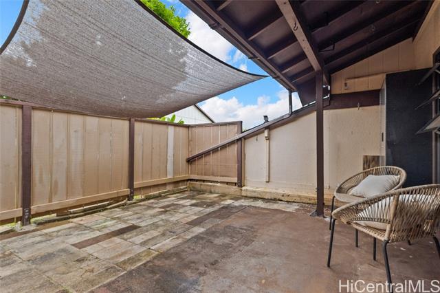 Welcome to this beautifully remodeled 3-bedroom, 2.5-bath townhome in desirable Mililani! This move-in ready home features durable vinyl plank flooring on the ground floor and a stunning kitchen with modern quartz countertops and updated cabinetry. Enjoy indoor-outdoor living with your own private fenced porch—perfect for relaxing or entertaining. The home includes two parking stalls and the convenience of a washer and dryer in the unit. All major appliances are included, making your transition seamless. Pet-friendly community adds flexibility for your household. Residents enjoy access to the Mililani Town Association pools and recreation centers, offering year-round amenities and activities. Maintenance fee covers water, sewer, and common area maintenance for added peace of mind.Conveniently located near Wheeler Army Airfield and Schofield Barracks, with easy access to shopping, dining, parks, and schools. Don’t miss this opportunity to own in one of Central Oahu’s most sought-after communities!
