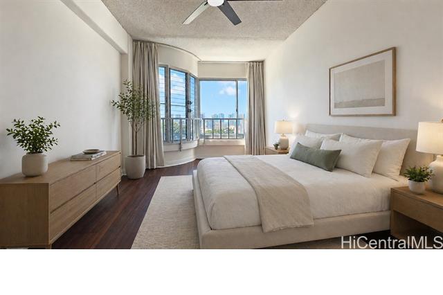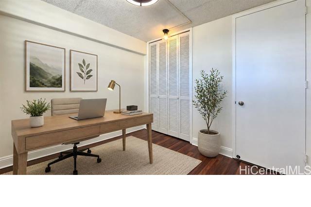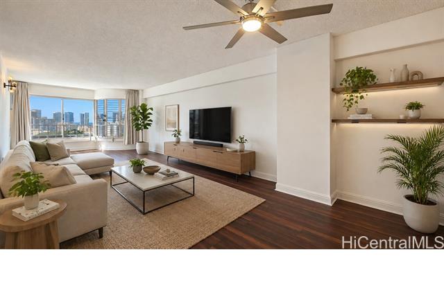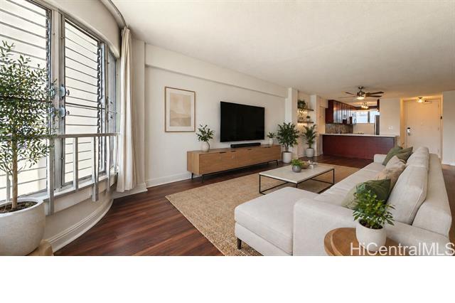 Beautifully maintained and updated 2-bedroom, 2-bath residence in desirable Lower Punchbowl with 1 covered parking stall, a large assigned storage space, and plenty of additional storage throughout the unit. This spacious home offers approximately 965 sqft of interior living area, including an enclosed lanai that creates flexible extra space—perfect for a home office, dining area, or lounge. Enjoy sweeping city views with partial ocean views, along with refreshing tradewinds that keep this side of the building cool and breezy. The home also features updated kitchen and bathrooms, plus the convenience of an in-unit washer and dryer. Located in a secure, pet-friendly building with an on-site building manager and a monthly HOA fee of $713. Centrally located near Downtown Honolulu, Ala Moana, major hospitals, shopping, dining, and easy freeway access. A fantastic opportunity to own a move-in ready home with great value in the heart of Honolulu.