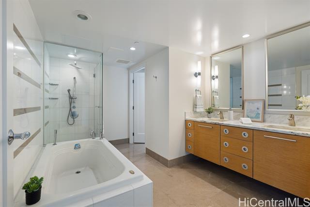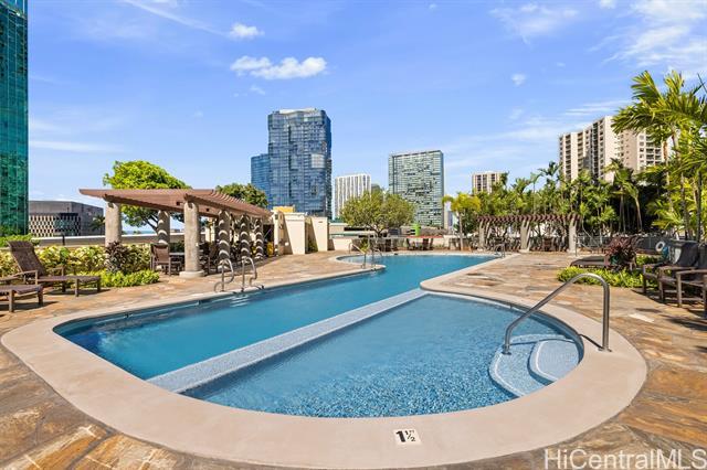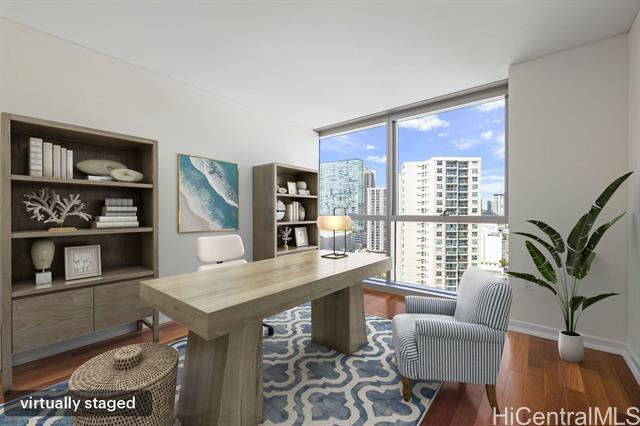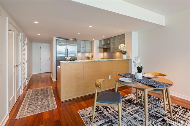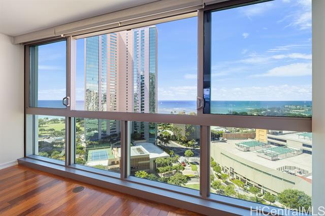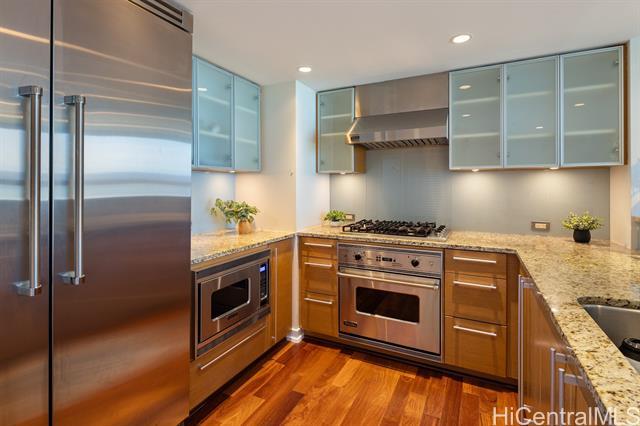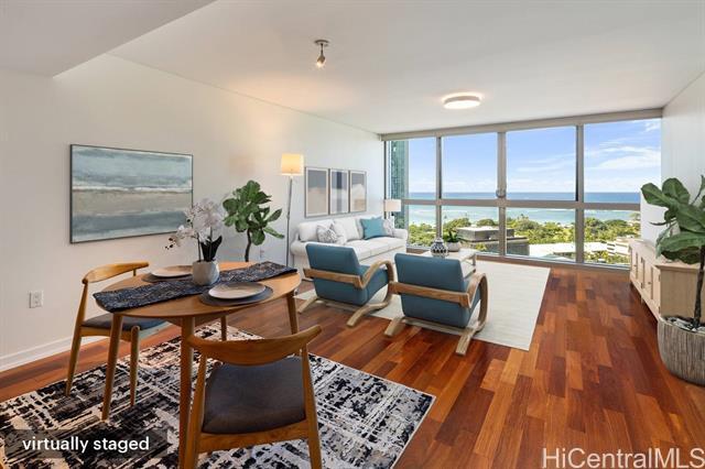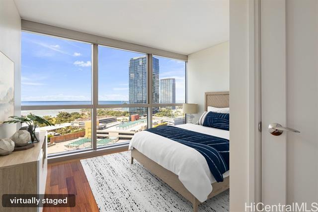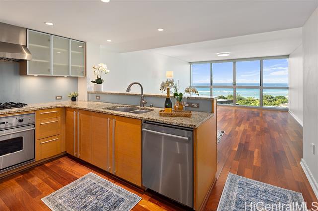 KO'OLANI - live in the jewel of Kaka'ako. Prime 3 bedroom, 2 bath floor plan with stunning ocean & sunset views. 2 side by side covered parking stalls conveniently located on the ground floor in the preferred parking garage for easy access. Upgrades include engineered hardwood floors, Toto toilets with washlet plus in both bathrooms, custom closet system in the primary bedroom and motorized shades in all rooms. Rarely available in a condo-Viking gas range & built-in refrigerator. New built-in microwave, newer dishwasher and front load washer/dryer. Brand new central A/C system and Nest controller for cool, comfortable living. Maintenance fee includes cable TV, gas, water, sewer, bldg insurance & common area maintenance. Amenities: heated saline pool, whirlpool, tennis courts, putting green, billiard room, movie/media room, business office, gas BBQ grills and gazebos, guest parking, full time staffed front desk & resident manager. Walking distance to Ala Moana Shopping Center, Ala Moana Beach Park, Foodland Farms, Whole Foods, restaurants, movie theaters, park and many more. Freshly painted and professionally cleaned. Ready to move in and enjoy living the life in Honolulu!