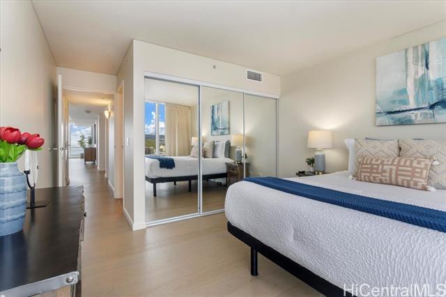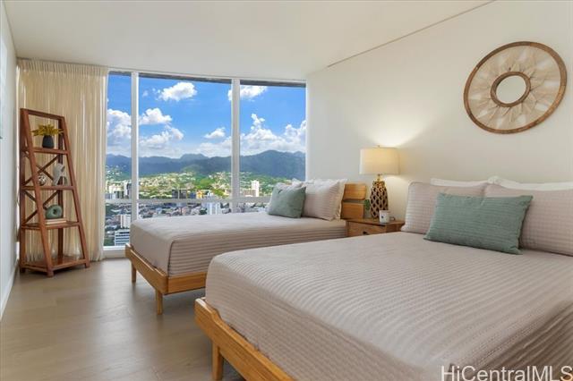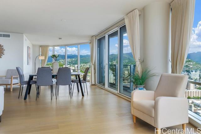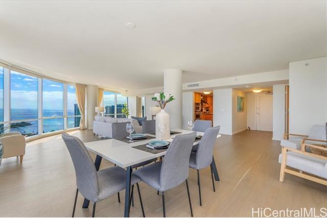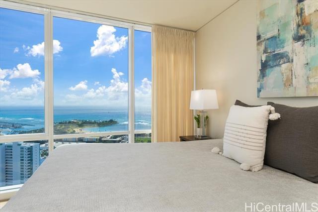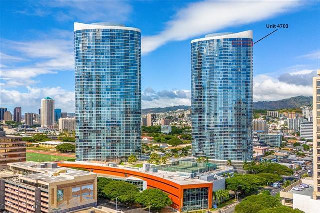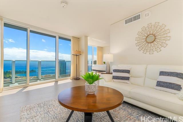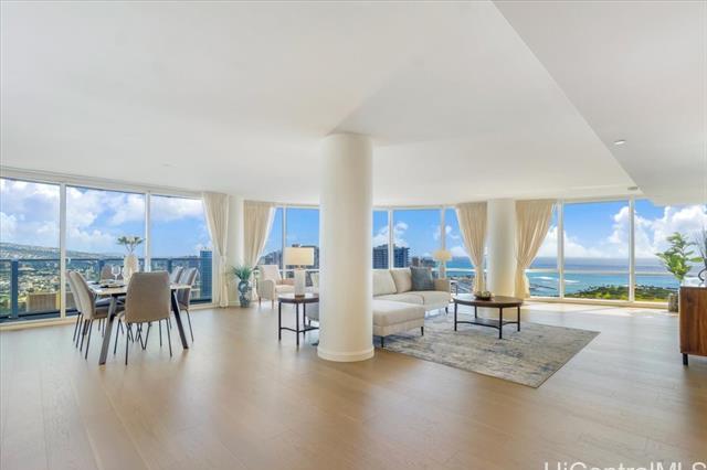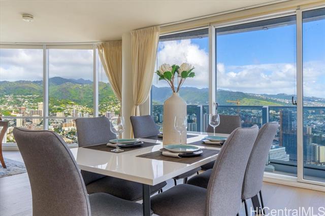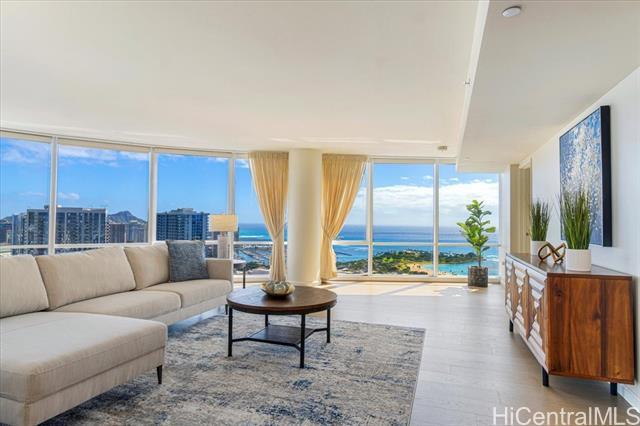 100% Hurricane insured. Perched on the 47th (double-unit) level right under the top floor, this stunning 3-bedroom, 3-bathroom residence offers unparalleled elegance, comfort, and breathtaking panoramic views. Upon entering, you are greeted by abundant natural light streaming through expansive floor-to-ceiling windows, illuminating the spacious and meticulously designed interior. Every detail of this residence has been thoughtfully curated to provide the utmost sophistication and functionality. Retreat to the primary suite, where tranquility awaits amidst awe-inspiring vistas of the Pacific Ocean and iconic Diamond Head. With its en-suite bathroom and generous closet space, this sanctuary offers the perfect balance of comfort and indulgence. Two additional bedrooms provide versatility for guests, a home office, or a personal gym, ensuring that every need is met with style and sophistication. With 3 parking spaces included, as well as a host of amenities such as a pool, fitness center, tennis courts, BBQ, and movie theatre Moana Pacific redefines quality living in Honolulu. Don't miss this rare opportunity to experience the pinnacle of island living.