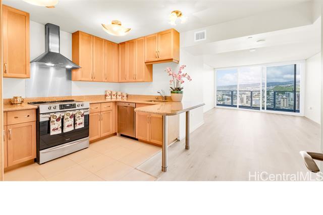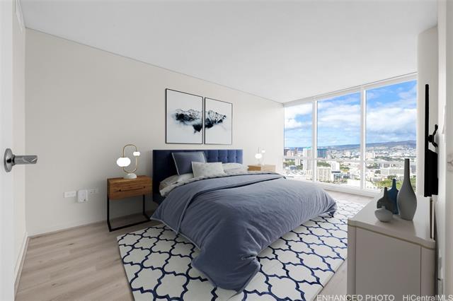 TWO (2) PARKING STALLS near elevator. High 47th Floor Below Penthouse! 2-bedrooms, 2-baths, 2-Parking Stalls on the Desirable Cooler side of the building. NEW Luxury Vinyl Planks Flooring, New Water Heater installed 12/8/22, Refrigerator, Electric Range, Dishwasher installed 3/2/20. Amenities include 24/7 Live Security, 2-Tennis/Pickleball courts, Golf putting green and driving cages, Large deck area with lounging sofas, tables and chairs, BBQ area, kids playground, Walking path, Party/Meeting room, theater. Pets allowed, check with management office.
