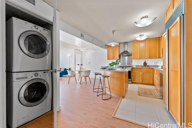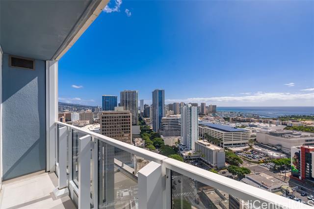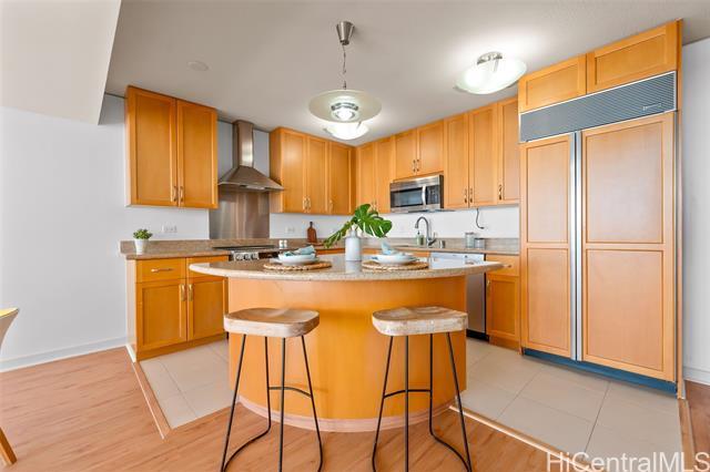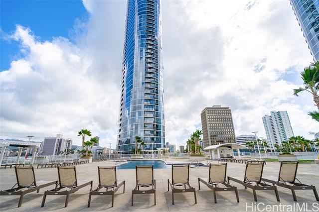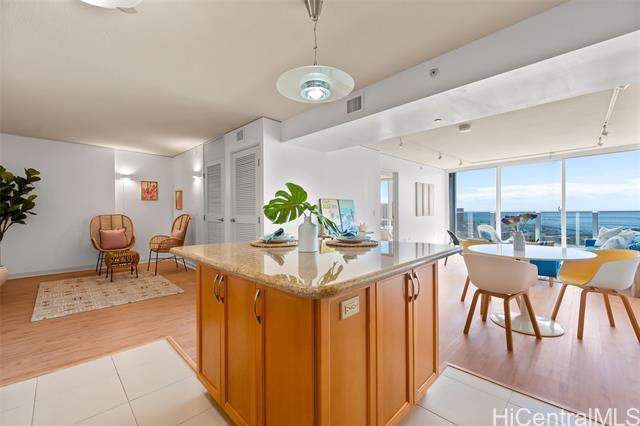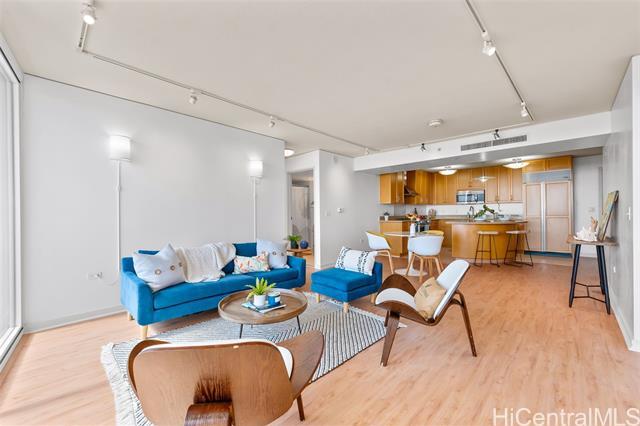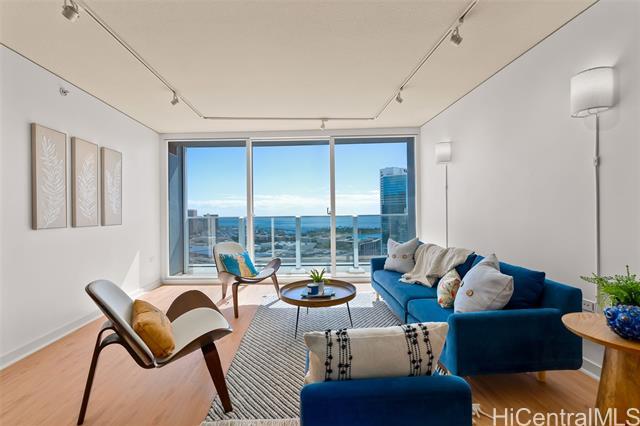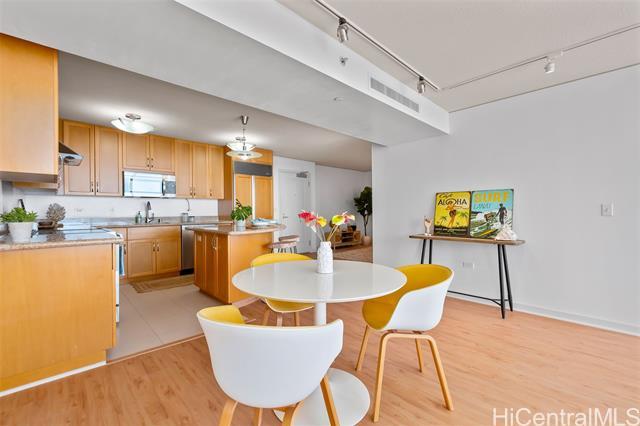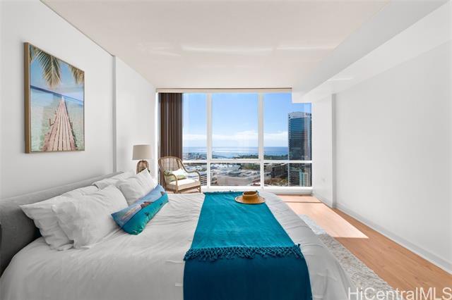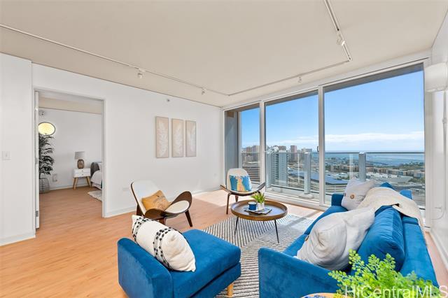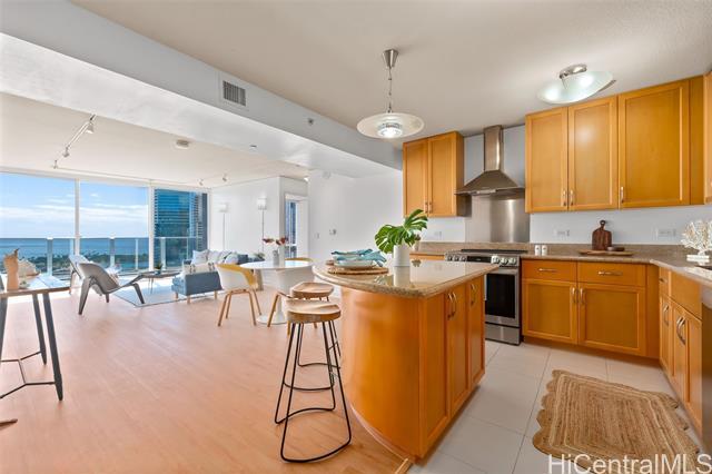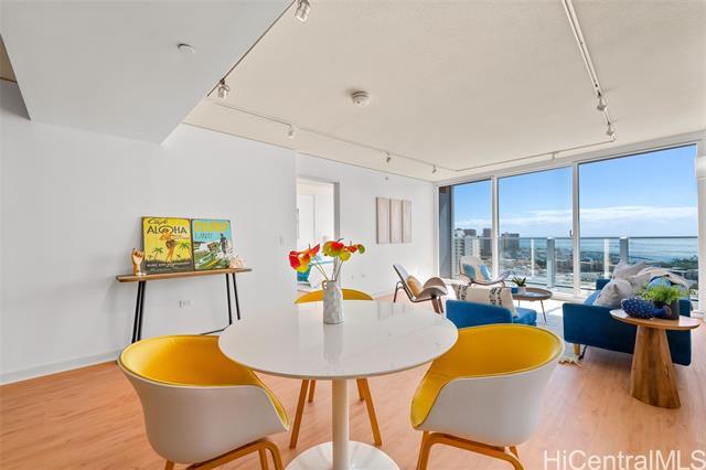 Welcome to Moana Pacific! This turnkey 2-bedroom, 2-bath residence features two side-by-side parking stalls and a versatile bonus den ideal for a home office, study, or flex space. The open-concept layout is enhanced by floor-to-ceiling windows that capture panoramic views of Diamond Head, the marina, ocean, city lights, sunsets and Friday night fireworks. Newly installed vinyl plank flooring throughout adds a fresh, modern touch. Enjoy urban convenience with resort-style living. Residents have access to exceptional amenities including 24/7 security, swimming pool, movie theater, golf hitting cages, putting greens, recreation areas, BBQ cabanas, tennis courts, a well-equipped fitness center, and guest parking. Pet-friendly building conveniently located near Ala Moana Center, Ward Village, dining, shopping, and beaches.