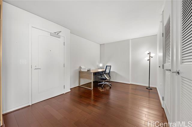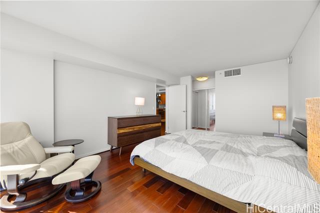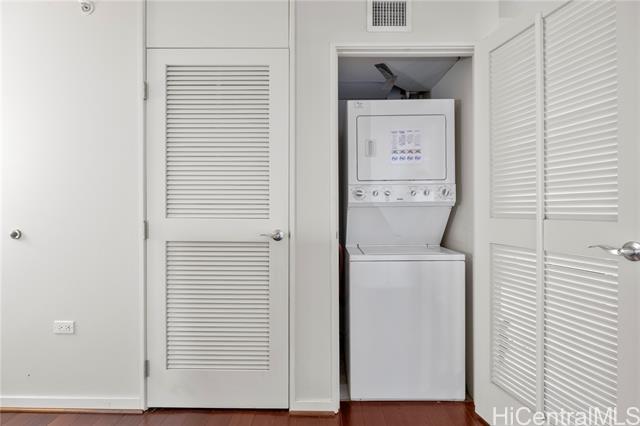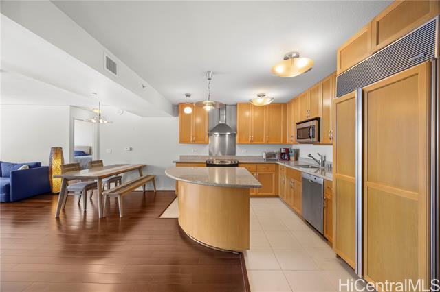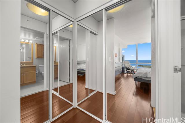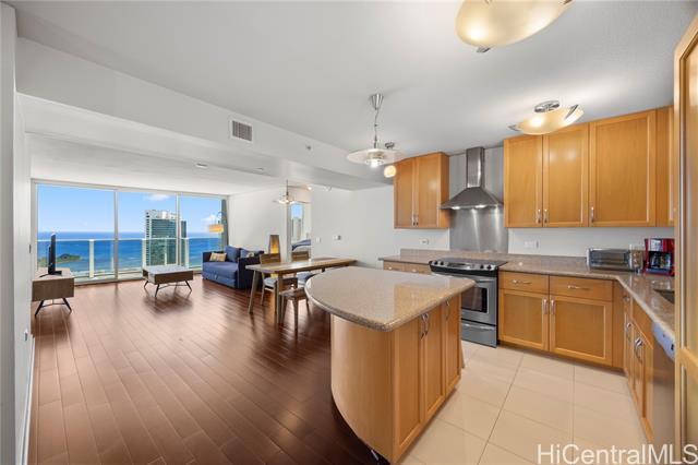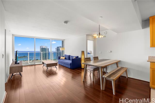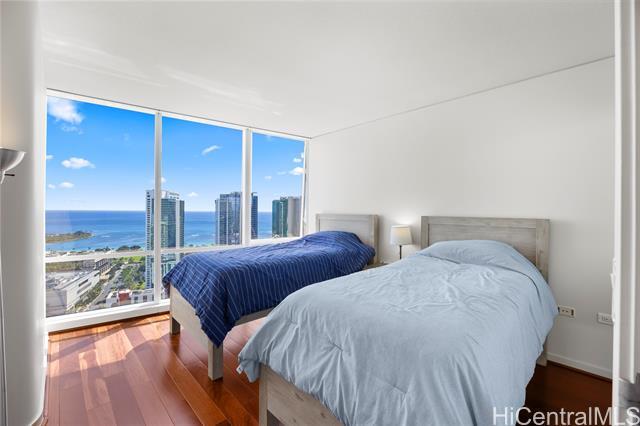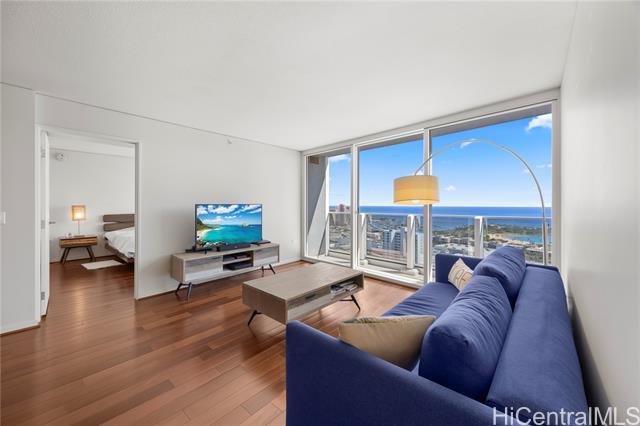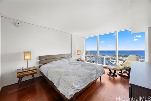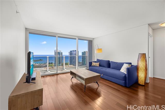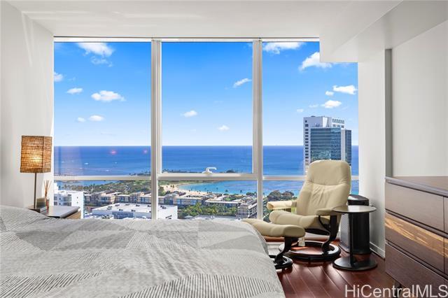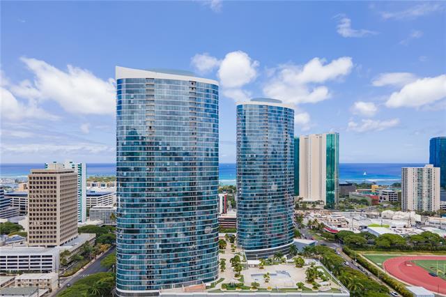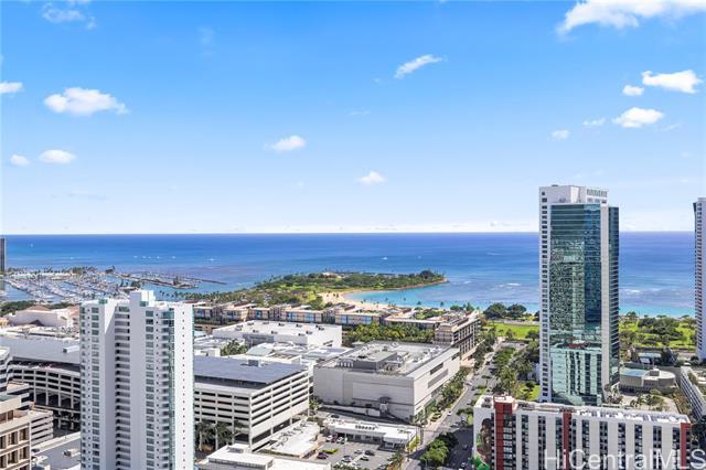 Luxury condo-living in MOANA PACIFIC East Tower with stunning ocean and city views from this high-floor beautifully maintained 2-bedroom, 2-bathroom + den unit. Floor-to-ceiling windows bringing in natural light and airflow. Two side-by-side parking stalls conveniently located on the ground floor (C1092 & C1093). Resort style amenities include beautiful pool area, whirlpool, party room, theaters, Fitness Centers, 2 tennis courts (one can be converted into two pickleball courts!), Putting Greens, Driving Range, BBQ. 24-hour security and secured elevator. Pet friendly building. Walking distance Ala Moana Center, Beach Park and Ward Village. Easy to see!