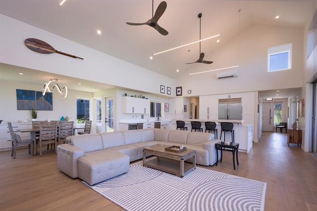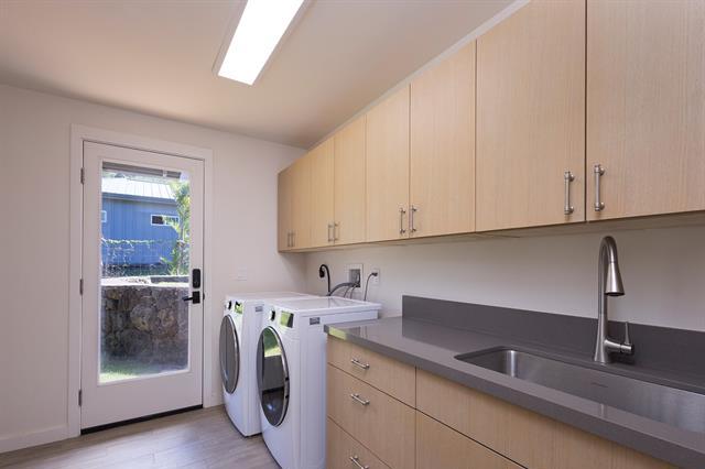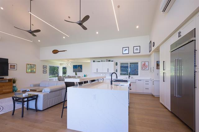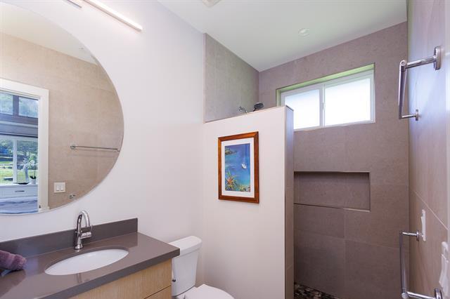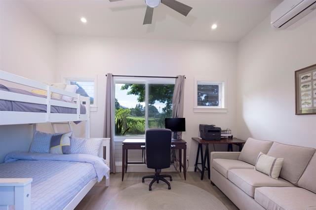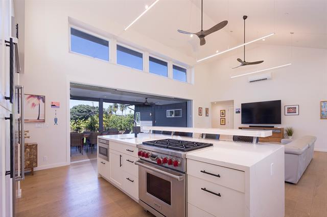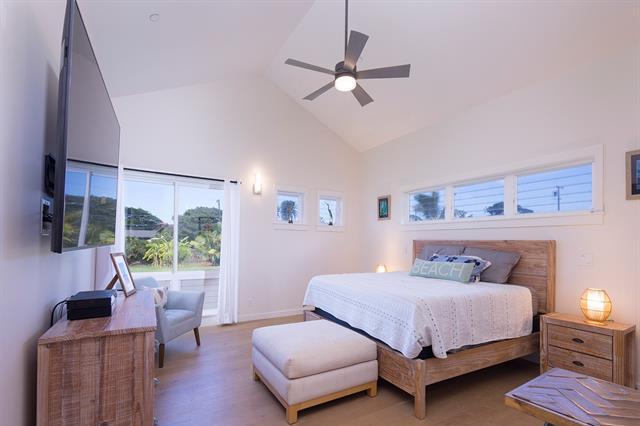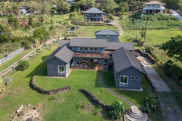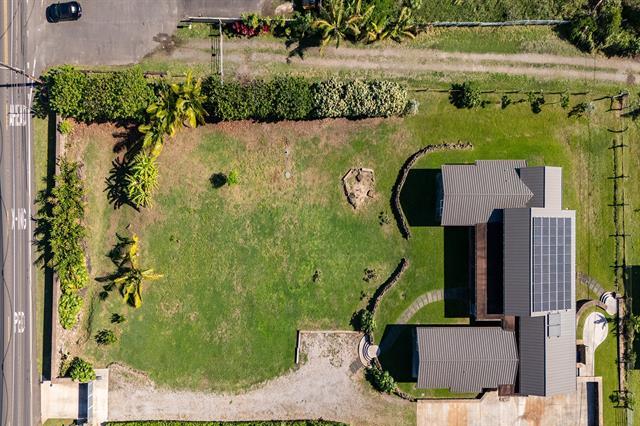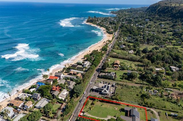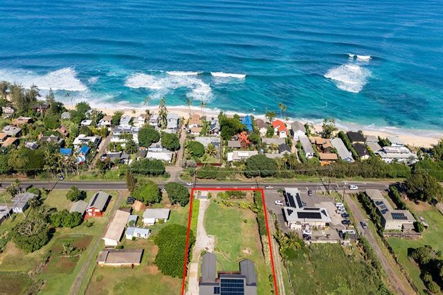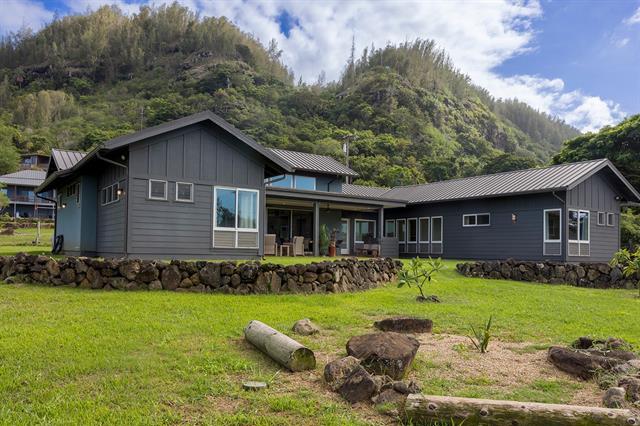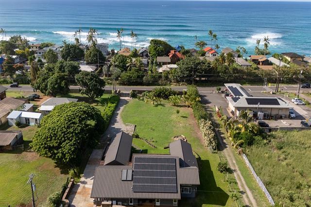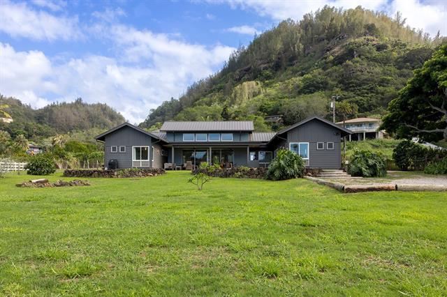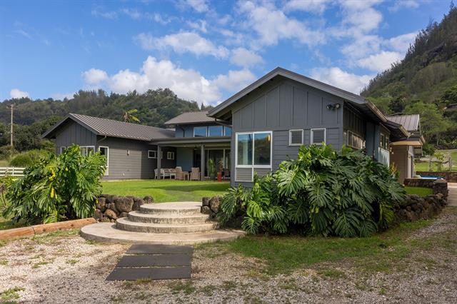 Welcome to Hale Laule'a. This custom-built North Shore Estate was designed by local architect Geoffrey Lewis and completed in 2021. This stunning ranch-style home is thoughtfully designed for island living. Features include vaulted ceilings, large windows, and an abundance of natural light that seamlessly connect the interior to the natural elements of the North Shore. The home offers open-air living with a covered lanai and expansive retractable glass and screen doors. Each of the three bedrooms is an en-suite, equipped with its own full bath. The home offers a versatile office or den off the main entry, ideally suited for a home office, guest room, or playroom, complete with an adjacent full bath for added convenience. The half bath is located off the main living area, ideal for guests and entertaining. Situated on over an acre of country-zoned land, this property includes mature tropical fruit trees and the ideal footprint for horse pasture and custom pool. A large rock wall lines Kamehameha Highway, automatic gate, and a turn-in point. The beach access is less than 500 feet from the driveway, offering you easy access to the world-famous beaches and surf of the North Shore.