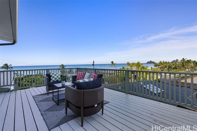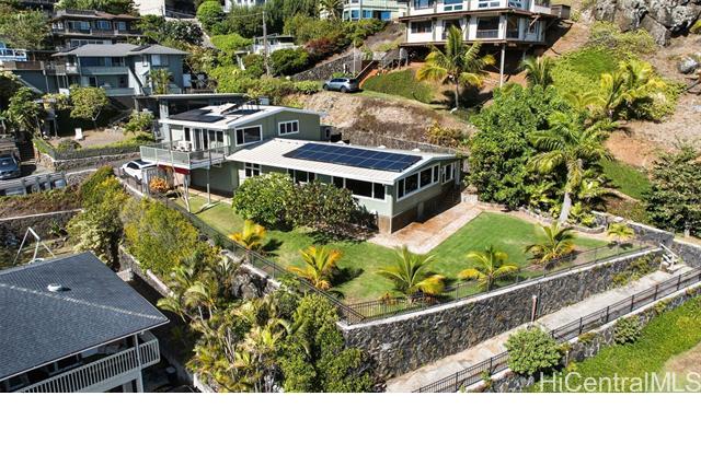 Exceptional Lanikai opportunity. Positioned just above the Lanikai entry, this elevated home enjoys sweeping ocean and Mokulua Islands views while remaining an easy stroll to the beach. The setting is private and lush, with terraced lava rock walls, tropical landscaping, and a flat back lawn perfect for entertaining or relaxing. FEMA flood zone X. This classic two-story Hawaiian beach home has been beautifully refreshed with a new kitchen, new flooring, new fixtures including two Toto bidet toilets, and split A/C in every room. Energy efficiency and comfort are built in with 32 owned solar panels, 3 Tesla Powerwall batteries, EV charger, new hot water heater, and new electrical panel. Additional highlights include new Lutron lighting throughout, a new second-floor deck with ocean views, upgraded windows, new plumbing, a Wi-Fi sprinkler system, and a security alarm. Actual square footage differs from tax records. Inquire about the pending opportunity to acquire adjacent City of Honolulu roadway parcels that could significantly expand the land area. Showings by appointment only