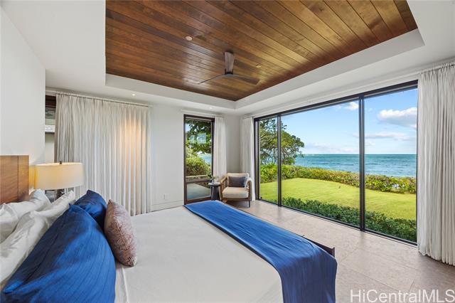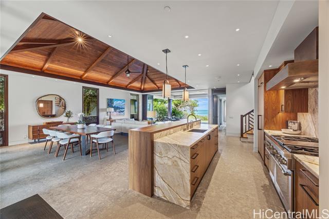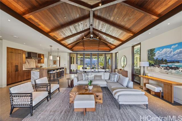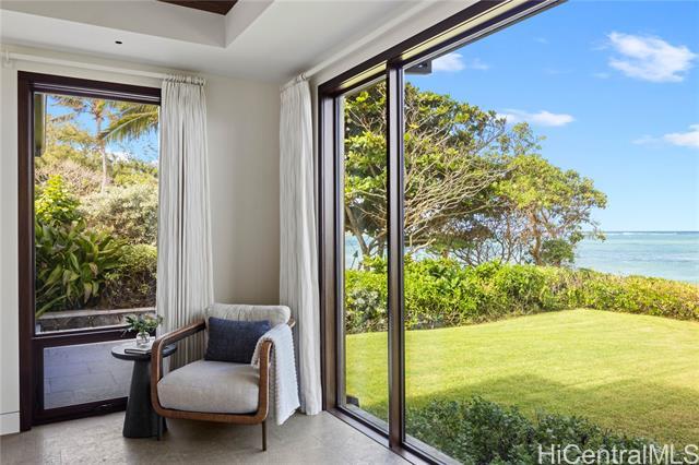 Masterfully designed beachfront residence in Malaekahana by architect Peter Vincent and Mokulua Builders. This exceptional home blends cutting-edge green design with dramatic ocean views and seamless indoor-outdoor living. A thoughtfully planned oceanfront lot features multiple pavilion-style structures that maximize views, natural light, and ventilation. The grand outdoor pavilion offers a covered lanai with full bath, kitchenette, travertine flooring, and mahogany doors opening to a lush courtyard. A striking 45-foot lap pool sits between the pavilion and main residence, creating a seamless water axis and direct connection to the ocean. Expansive lanais and large glazed walls bring in ocean breezes and continuous coastal views. Refined finishes include natural stone floors, limestone feature walls, custom woodwork, teak stair treads, mahogany railings, and custom doors and windows. A rare opportunity to own a world-class oceanfront estate on Hawai‘i’s North Shore—pairing modern luxury with thoughtful sustainability in one of the island’s most desirable settings.