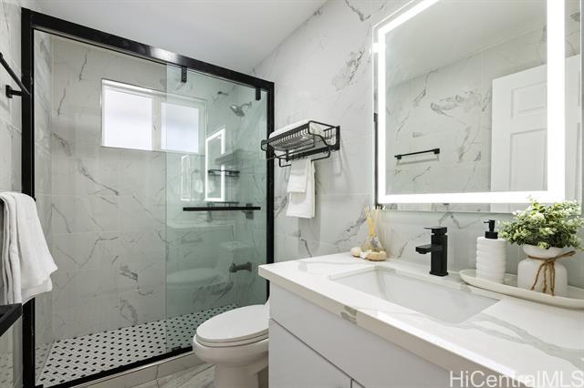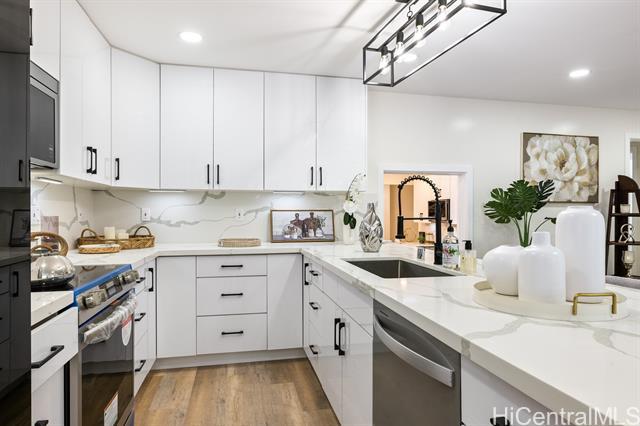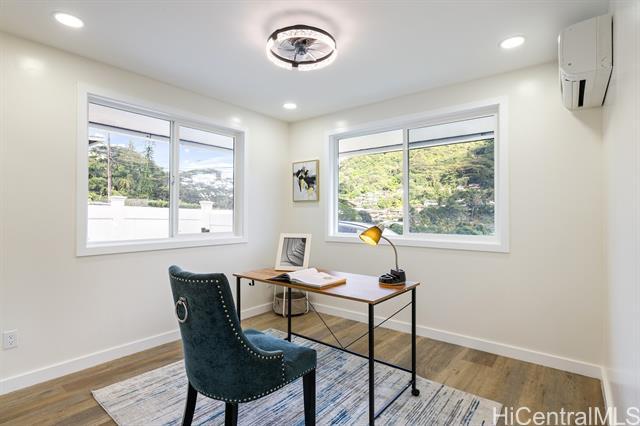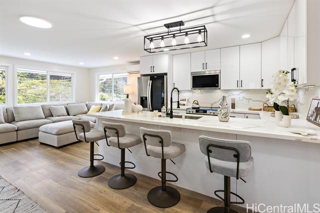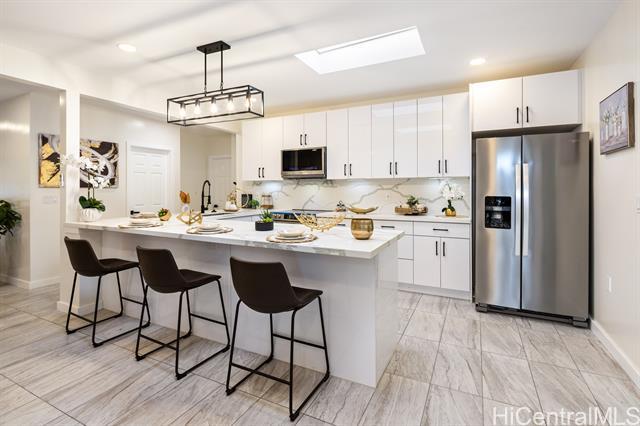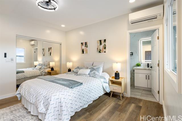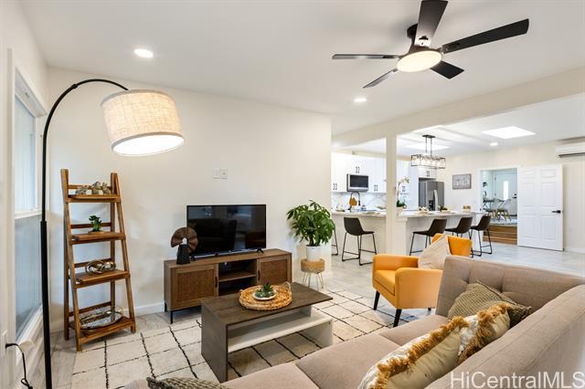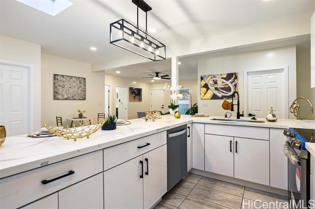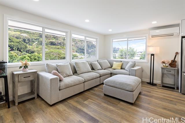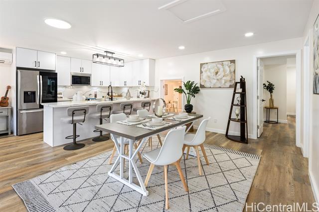 Discover this beautifully renovated 7-bedroom, 4-bath luxury home tucked away in the peaceful heart of Kalihi Valley. This rare property blends modern comfort, island charm, and multi-family versatility. Enjoy two spacious living rooms and two fully equipped kitchens with brand-new stainless steel appliances, stylish laminate flooring, and a chef’s dream U-shaped island. Each bedroom has its own split A/C for year-round comfort. Meticulously updated by a licensed contractor with proper permits, this home includes new electrical wiring and plumbing. Designed for flexibility, it offers three separate entrances—ideal for multi-family living or rental opportunities. Energy-efficient solar hot water heating adds sustainability and lowers costs. Relax or entertain on the rooftop terrace with breathtaking mountain views—perfect for yoga, barbecues, or stargazing. Outside, a tropical garden with lush greenery, vibrant flowers, two mature mango trees, and an automatic irrigation system creates your island retreat. Additional highlights include four parking stalls, ample street parking, and a quiet cul-de-sac minutes from schools, shopping, and freeway access.