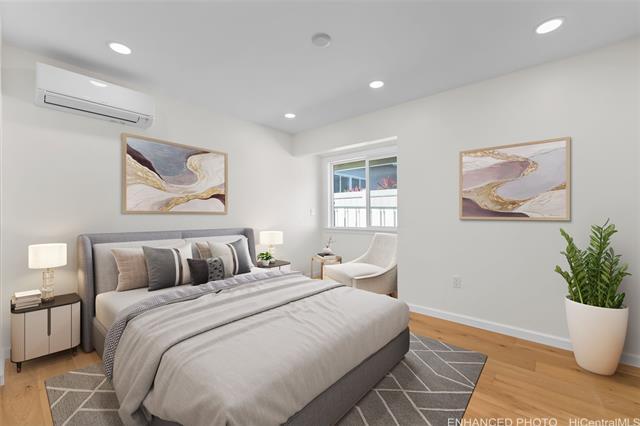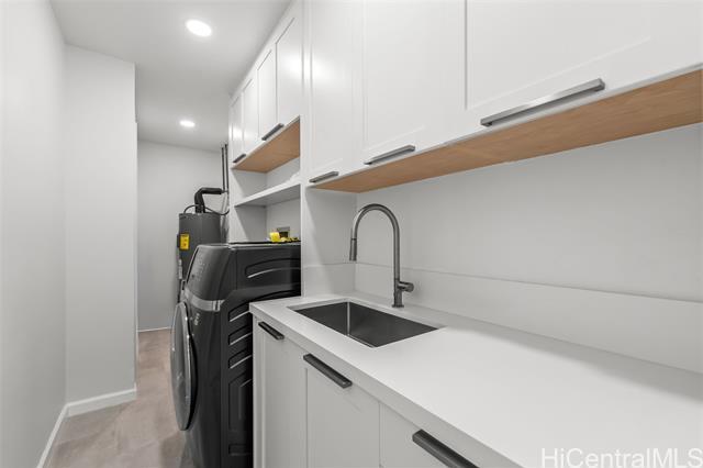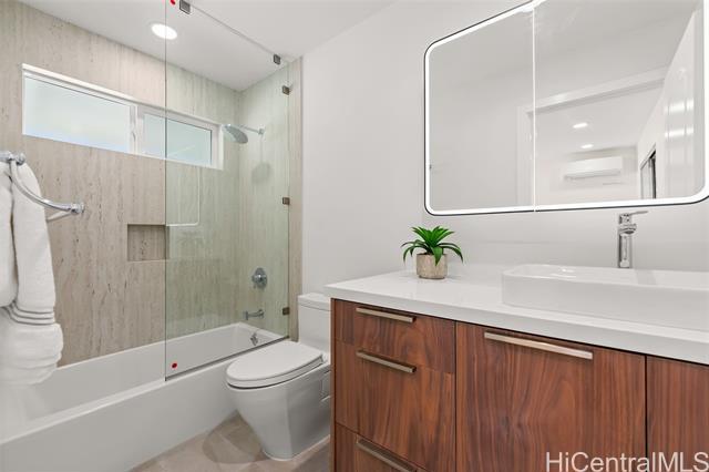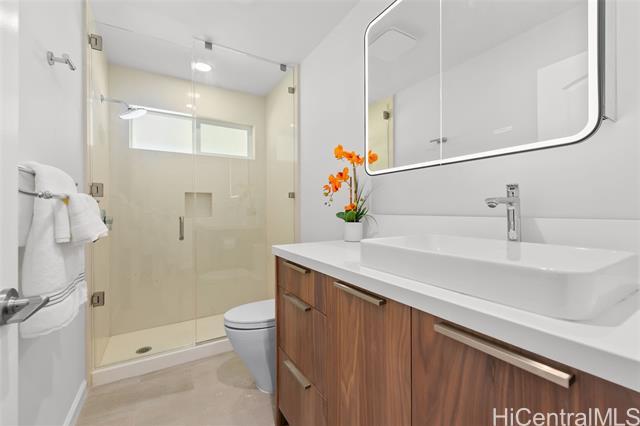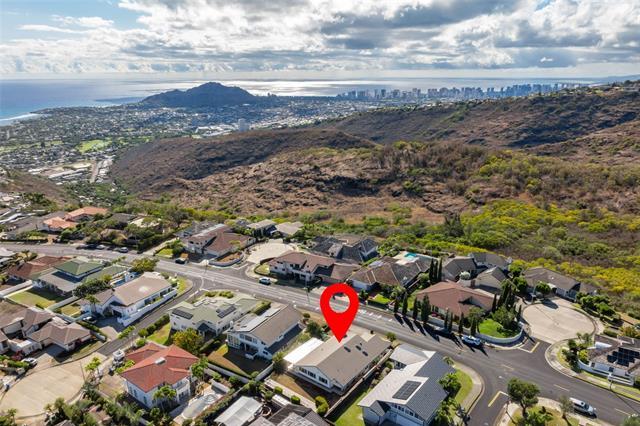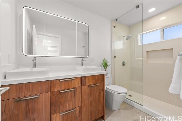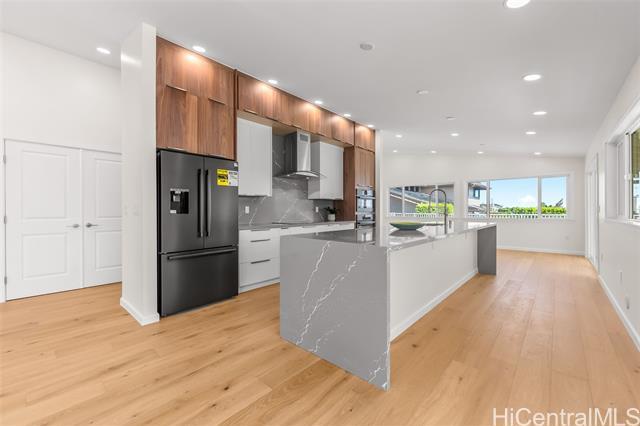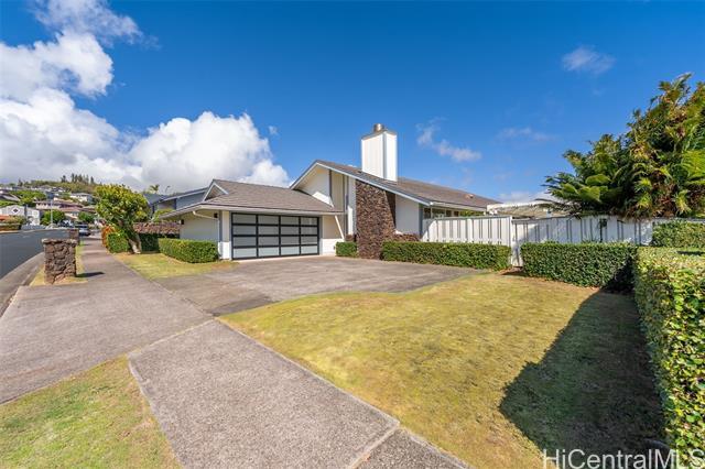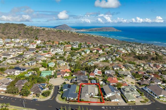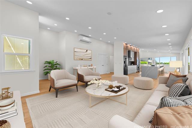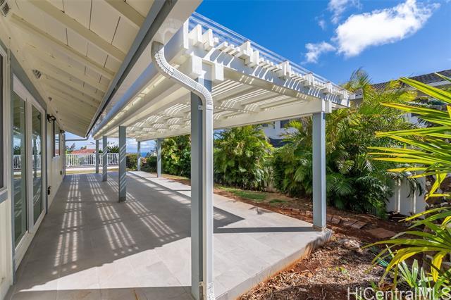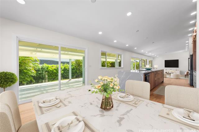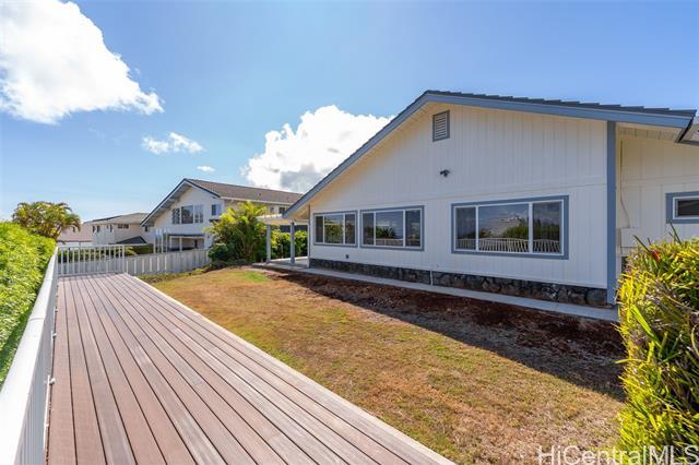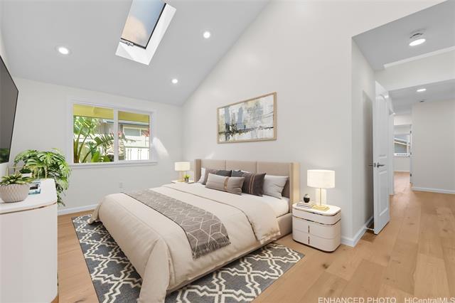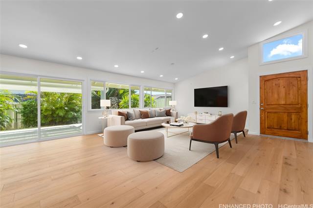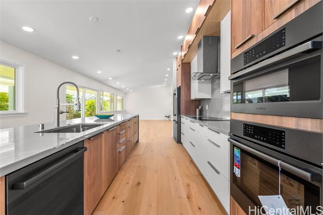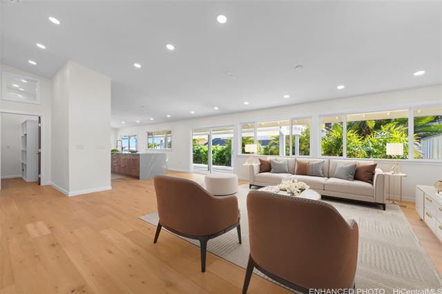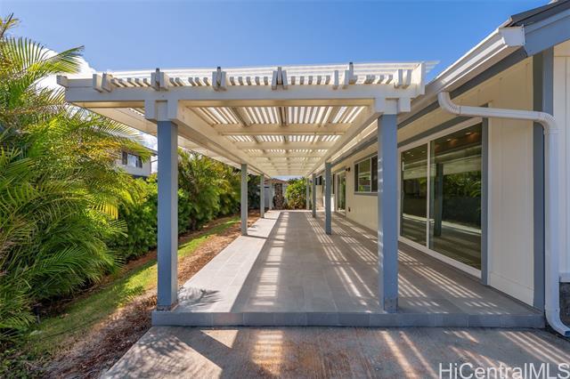 Nestled within the private/gated community of Waialae Iki V, this beautifully fully renovated single-level residence blends contemporary elegance with island living. Featuring three spacious bedrooms and three full bathrooms, this home offers a seamless blend of luxury, functionality, and comfort. Step inside to discover soaring ceilings and rich wood flooring that flows effortlessly throughout the open-concept living spaces. All bathrooms are finished with sleek porcelain tiles, Toto toilets, and frameless glass-enclosed showers, creating a spa-like experience in every suite. At the heart of the home is the designer kitchen outfitted with high-end, natural wood-faced cabinetry, a striking waterfall-style island, and brand-new luxury appliances. Enjoy an abundance of natural light thanks to strategically placed skylights and quality aluminum roof shingles that add both style and durability. The home is surrounded by tropical landscaping with an open lawn, covered lanai, and an expansive open deck—perfect for indoor-outdoor living and entertaining.