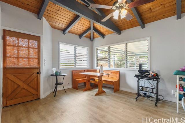 Discover this exceptional four-bedroom, three bathroom home on a quiet dead-end street in Maili. Recently refurbished, this 1,832 sqft residence features durable construction and an open concept living space. Exposed beam ceilings create a sense of spaciousness and architectural charm. The primary bedroom offers a private retreat, while three additional bedrooms provide flexibility for family and guests. There's also a dedicated office area for remote work or creative pursuits. The back patio is perfect for morning coffee or sunset relaxation, with gentle trade winds keeping things comfortable year-round. You're minutes from Maili Point Beach Park where ocean adventures await. Move in and enjoy island living right away! Quality construction, recent renovations and a welcoming atmosphere are waiting. This is more than a house; It is a place where memories are made.