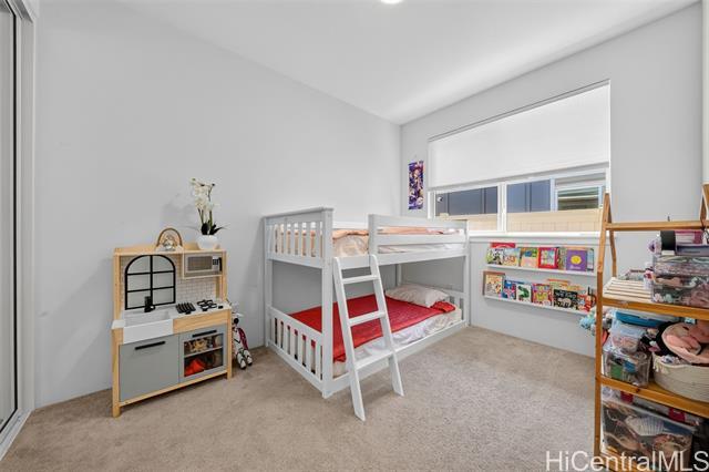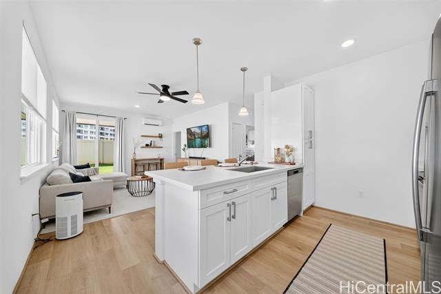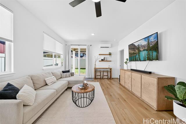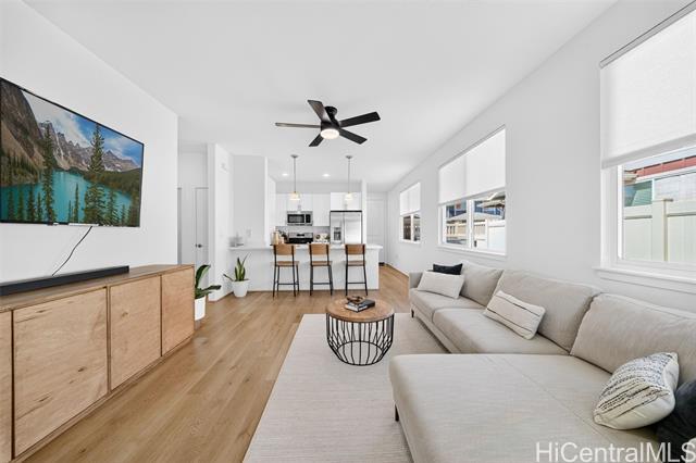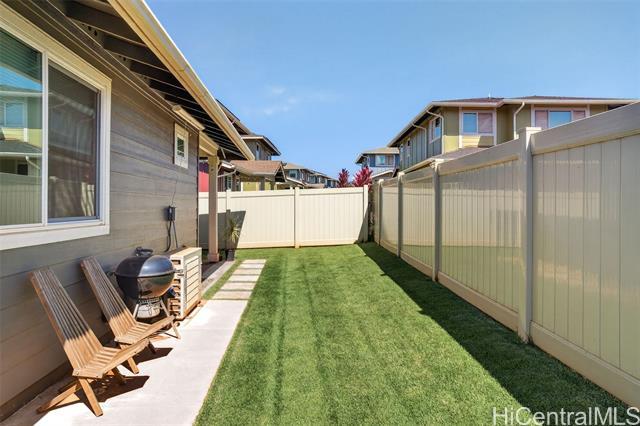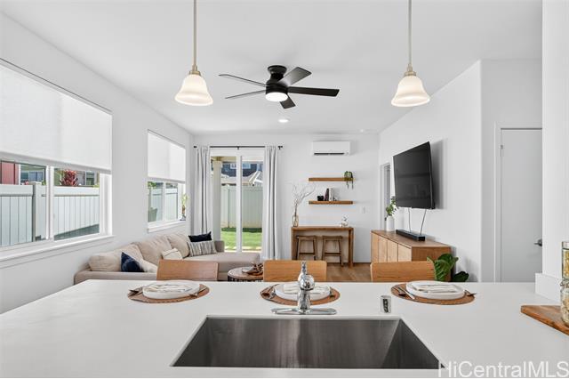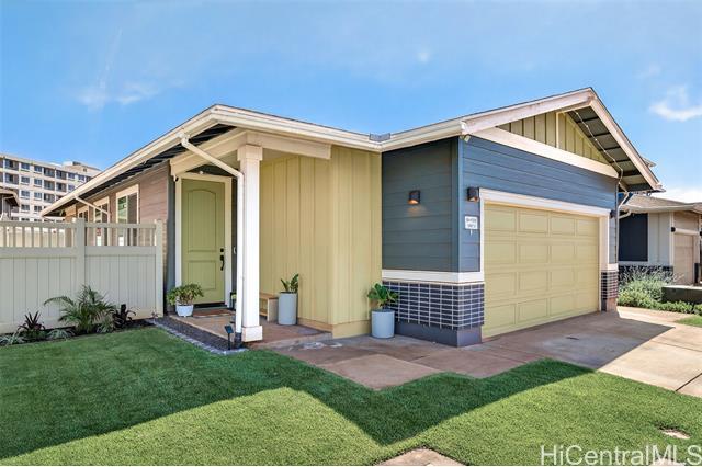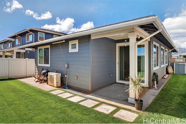 Discover the perfect blend of comfort and convenience in this charming Waioha single-level 3-bedroom, 2-bath home nestled in the beautiful and growing community of Koa Ridge. Designed with families in mind, this home offers an open floor plan with 9-foot ceilings, split A/C in every room, and stylish finishes throughout. You’ll love cooking and gathering in the modern kitchen featuring stainless steel appliances, a Kohler double sink, solid-surface countertops, and white soft-closing cabinets. Thoughtful details like USB outlets in the kitchen and primary bedroom add everyday convenience, while luxury vinyl plank flooring and wall-to-wall carpet bring warmth and durability for busy family living. Step outside to your fully fenced yard with a covered lanai—perfect for outdoor meals, weekend BBQs, or letting the keiki and pets play freely. Energy-efficient upgrades include a solar hot-water system, EV-ready garage outlet, PV-ready setup, LED lighting, and an ENERGY STAR® dishwasher to help keep your home running efficiently. Conveniently located near Waipio Costco, shopping centers, parks, schools, and with easy freeway access—everything your family needs is just minutes away.