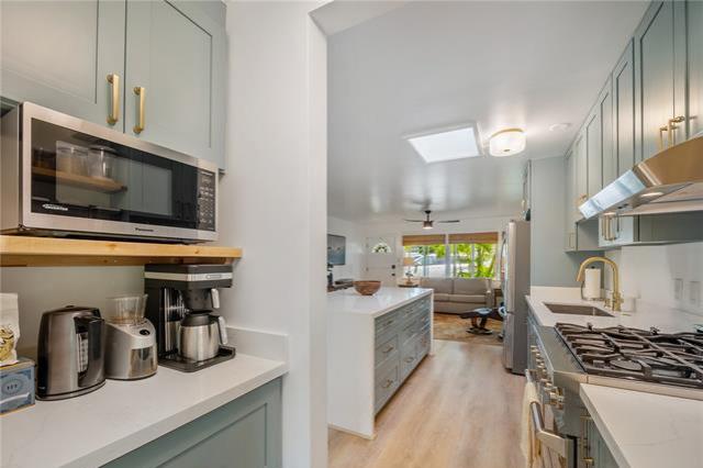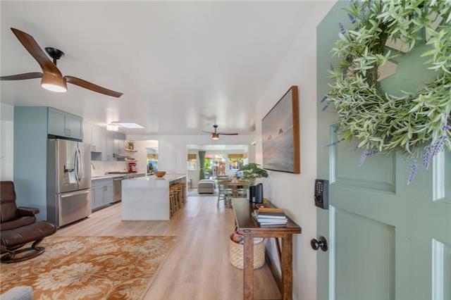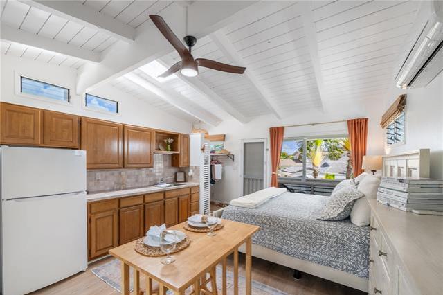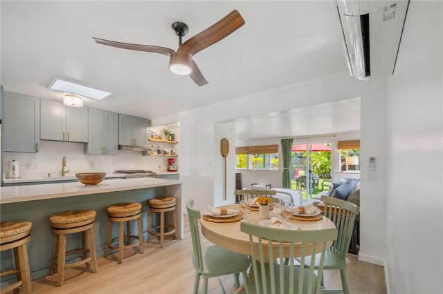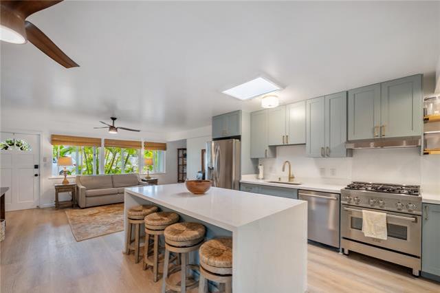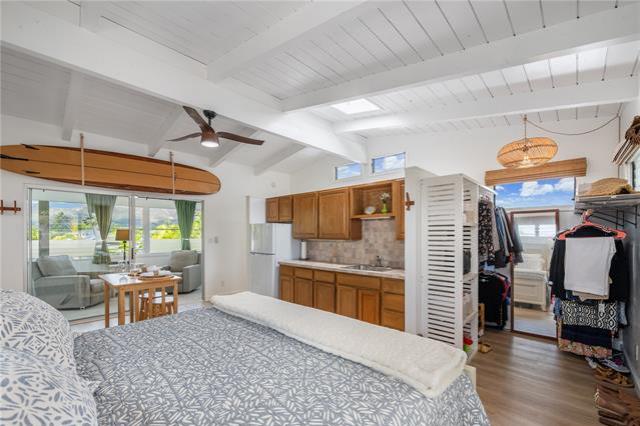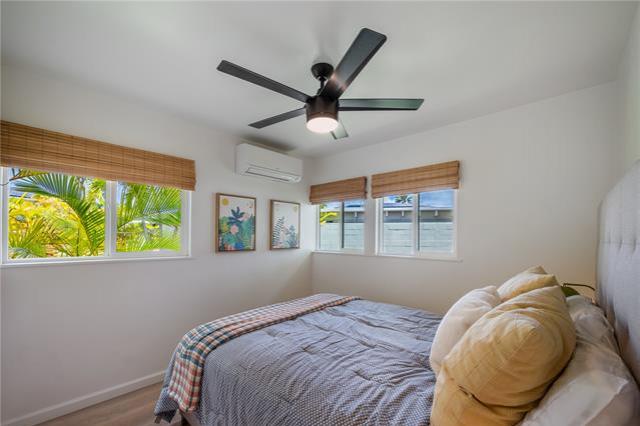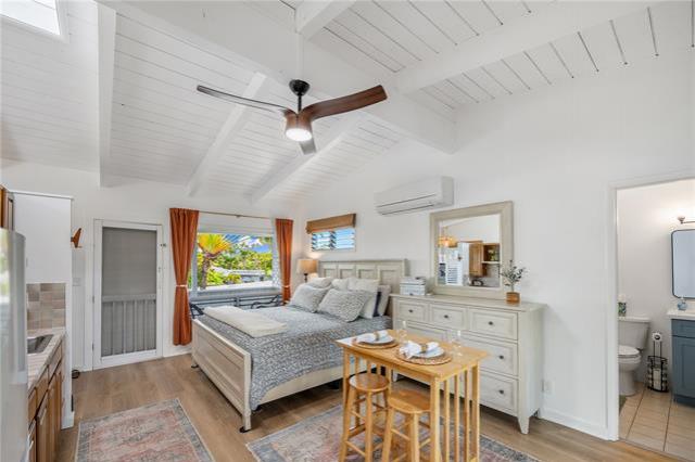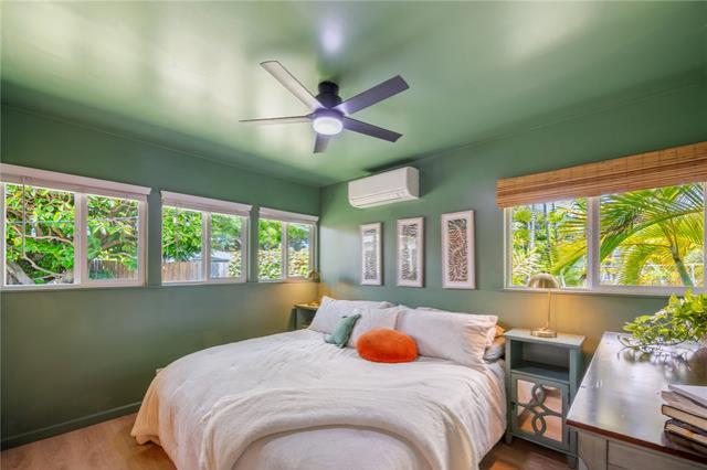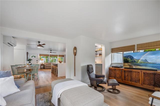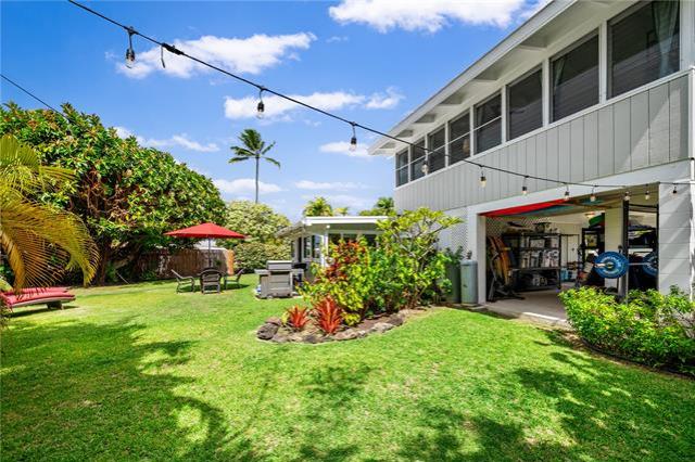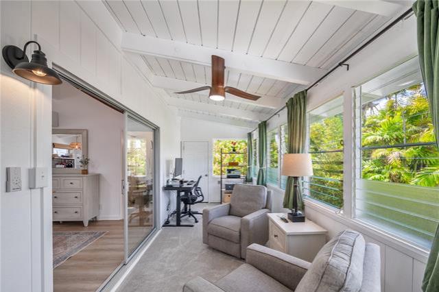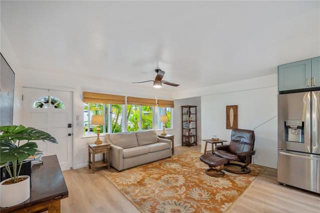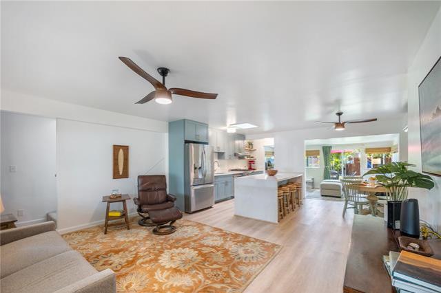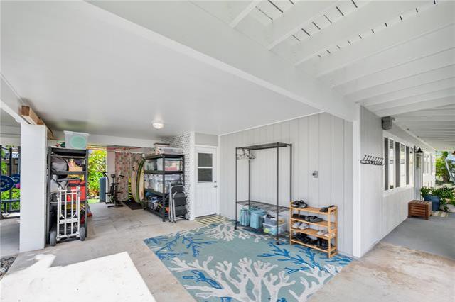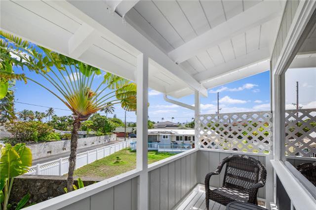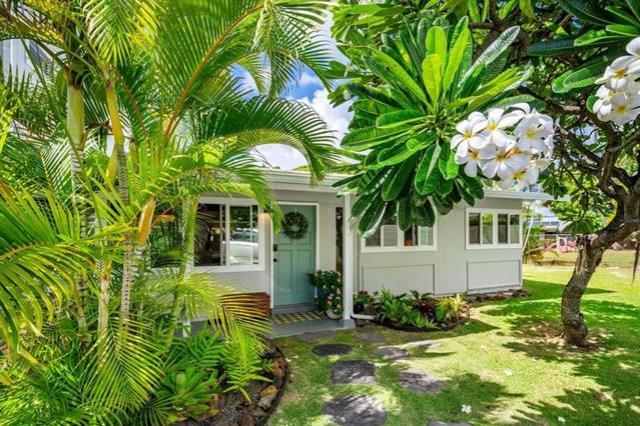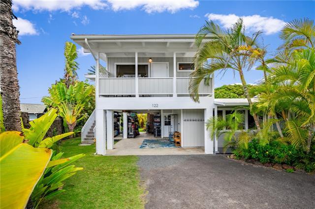 The scent of plumeria greets you up the path to the entry of this charming and intimate hideaway. Intended as a forever home, lots of love went into upgrading this hidden gem in the coveted Kalama Tract area, very close to the Kai One tree lined right of way that leads to an endless stretch of white sand beach + azure blue water. The Kitchen is fully remodeled + opened to the living + dining areas, creating a great room, with new cupboards, appliances + fabulous island + counters all covered with classic white quartz + flows into a bright sun room + beyond to the large private tree lined yard. A flexible floor plan allows for multigenerational living with ocean breezes + mountain serenity on the upper covered lanai + an extra fully enclosed sitting/office area with separate stairway from outside as well as an inner stairway connecting both levels. Upstairs suite has it?s own fridge + a full bank of cupboards for morning coffee in bed or on the lanai. The extended carport can easily double as parking spot + a wonderful storage area + still boasts a separate laundry room with new stainless front loading washer/dryer, a drink fridge + room for more storage! As dreamy as it sounds..