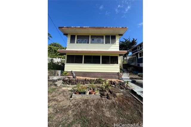 Last street up on Kamehameha Heights. Very little cars go by. Original home and Owner's Husband built the second level. Large front and back yard Kam school in back.Roof has 3 layers redone through the years. Lower level 1035 sq ft consists of 2 bedrooms and 1 bathroom. Upstairs 2 bedrooms and 1 Bath, Living and Kitchen. Home can be rental or multi Family living. Great neighbors.Two workrooms in front of the home with enclosed and sceeen in and on the side under the house. Washer and clothes line in back of the house.Solar water Heater (solar Help )and Gas Stove in upstairs Kitchen. Remodel or ReBuild.Yellow house after the blue one!! Cool Breezes. Close to schools, shopping , and Freeways. 1 car covered garage and 2 spots in front.