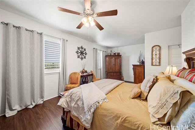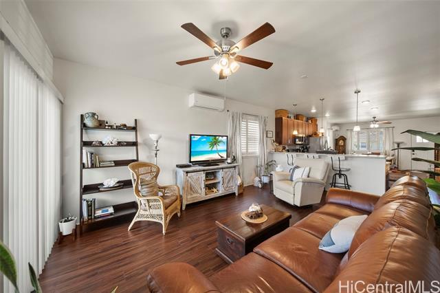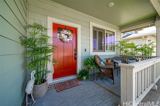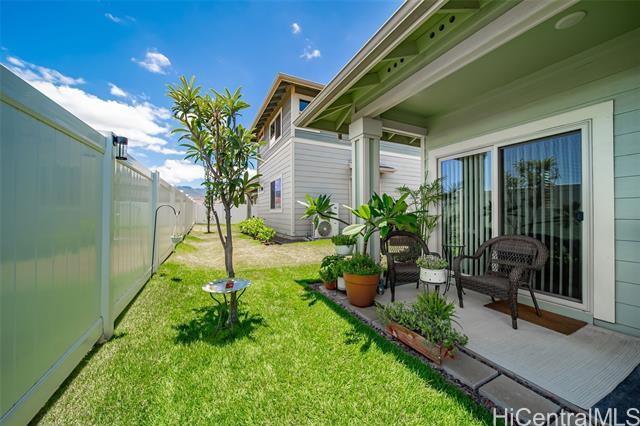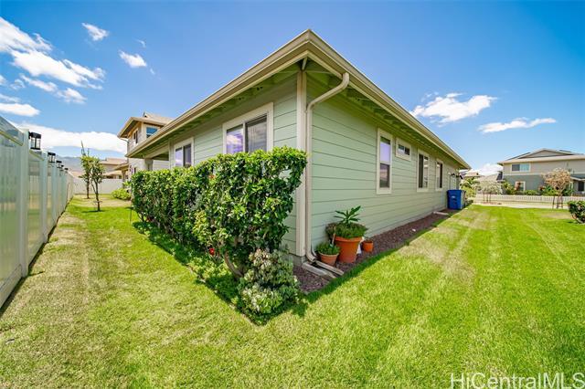 This beautiful new home is located in the highly desired community of Hoopili. It offers easy access to shopping centers, the new rail system, and the highway.. This house is a well-maintained property with three bedrooms and two bathrooms. It is connected to natural gas, which provides several advantages. The gas range in the kitchen allows for efficient and precise cooking. Additionally, a tankless water heater ensures instant hot water while saving on energy consumption. There is also a gas BBQ stub, providing a convenient setup for outdoor grilling. While the current washer and dryer are electric, there is a gas hook-up available. Outside, the home features a spacious yard, perfect for entertaining, or enjoying outdoor activities. The property is equipped with 15 owned Solar (photovoltaic) panels and 2 Tesla Batteries, 5 ceiling fans, Plantation shutters throughout, and a dedicated 20 amp in lanai for the smoker. The large covered lanai provides a comfortable space to relax and appreciate the beautiful surroundings. This community also offers a range of other amenities, including playgrounds, a pool, a rec center, and a pickleball court.