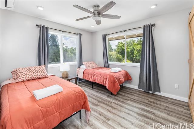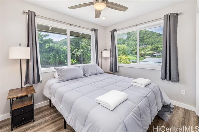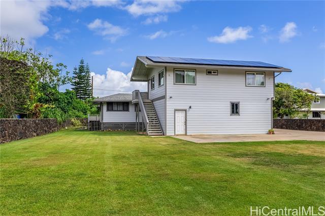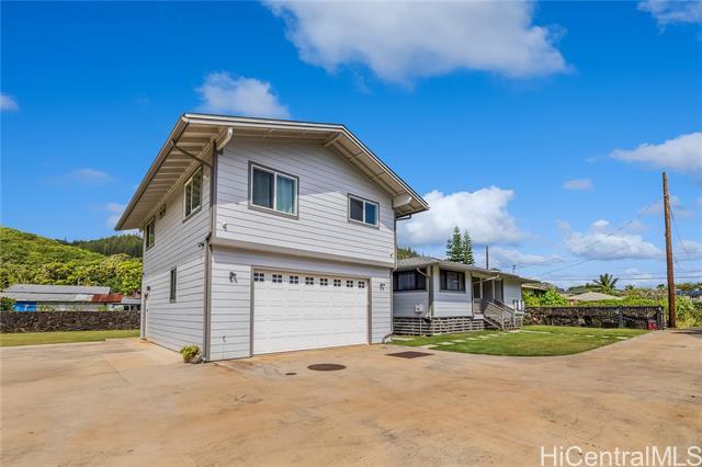 Tucked away by the foot of the breathtaking Ko‘olau Mountains, this home embodies the essence of relaxed island living. As you arrive through a secure gated entrance, you are greeted by gentle mountain breezes and the sound of rustling palms, setting the tone for the peaceful lifestyle this property offers. The main home, that was fully renovated in 2015, features 3 bedrooms and 2 bathrooms, with an open-concept layout that fills the living spaces with natural light, creating a warm and welcoming atmosphere. The living area flows seamlessly into the recently renovated kitchen and dining spaces and out on to the back lanai. A detached 2-bedroom, 1-bathroom ADU built 2020 above the garage, provides great flexibility-ideal for guests or rental income. Set on an expansive 19,000+ sq. ft. lot with an elaborate 5' rock wall for privacy, there's plenty of room for outdoor activities, gardening, or simply soaking in the stunning mountain views. Enjoy peaceful mornings with panoramic mountain vistas and quiet evenings enveloped in the natural beauty of the lush Hau‘ula landscape—all just moments from pristine beaches, local dining, and the authentic charm of Windward O‘ahu.