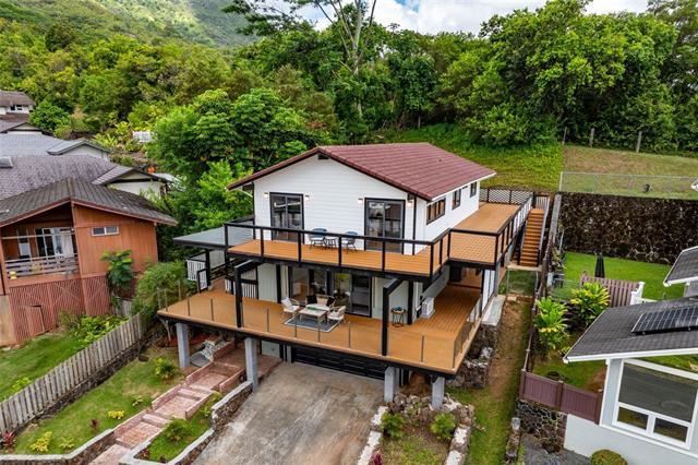 Located in the highly desirable neighborhood of Maunawili, this beautifully remodeled home sits under the breathtaking and serene mountains while the location provides a peaceful and relaxing environment. This home offers an enclosed garage and two levels of living space with wrap around decks on each floor (approx. 570 sf on the second level and almost 1000 sf on the top level), perfect for entertaining family and friends. You will love the attention to details throughout. The main floor boasts an open concept design with a large open kitchen with Cafe Brand appliances, a walk-in pantry, full bathroom and a bright, spacious living room perfect for entertainment and enjoying the views. The upper floor offers 4 bedrooms and 2 bathrooms. The primary bedroom is designed with a walk-in closet, spa like bathroom with a soaking tub and separate shower, a wall mounted electric fire place, and a wine refrigerator. Come home and appreciate the jacuzzi and BBQ grill that is included on the deck. Maunawili is just a short distance away from Pali Hwy, H-3, Downtown, shopping centers and to the beaches.