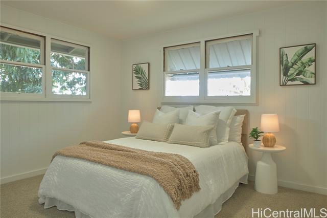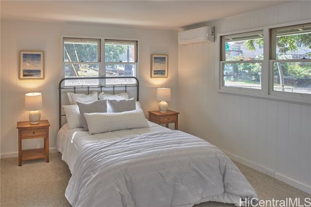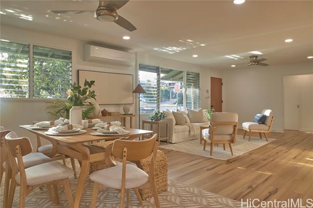 Located in this quiet, established neighborhood is this wonderful, upgraded single-level home. Beautiful and bright, the large kitchen has stainless appliances including beverage fridge, generous counter space and kitchen island, and soft close cabinetry. Ceilings are smooth drywall and there's recessed lighting in kitchen, dining and living areas. The floorplan flows beautifully, making the home feel spacious, and the split a/c and ceiling fans make for comfortable living. The many windows bring natural light and breezes. Vinyl flooring in kitchen/living area and the nicely sized bedrooms are carpeted. Roof is less than 10 years old; there's fresh paint inside and out and a renovated bathroom. Updated electrical and all copper plumbing including new drain lines. These many updates make this home move-in ready! The large, level corner lot feels private, is fully fenced and has mature mango, lychee, avocado, papaya and tangerine trees, and banana plants. The carport is extra-large for multiple cars and has storage. Stellar location, just minutes to freeway access and close to Don Quixote, Walmart, Home Depot, and restaurants. Home was just tented and has a warranty. A must-see home!