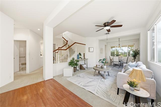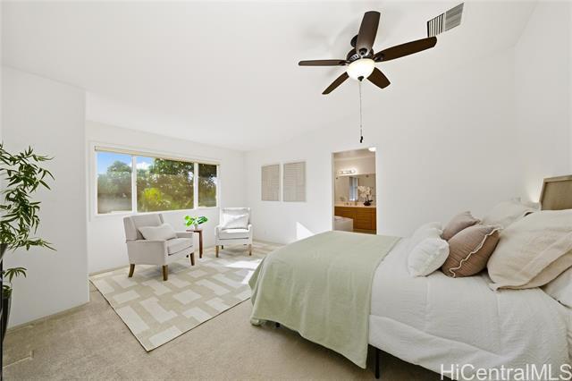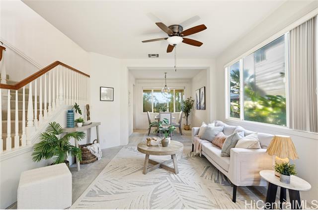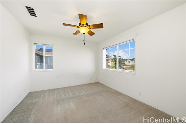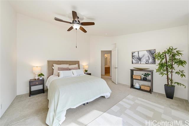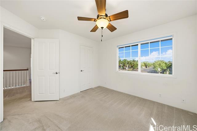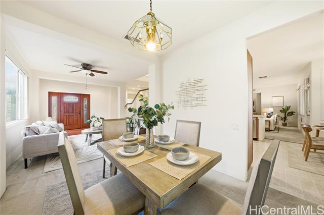 Welcome to this spacious five-bedroom, three-bathroom single-family home in Ewa by Gentry Woodbridge. Step inside to an open and inviting floor plan with generous living areas filled with natural light. With five bedrooms, including one on the main level, this home provides flexible living options for multi-generational living, guests, or a home office. The primary suite features a spacious layout with an ensuite bathroom and a large soaking tub perfect for relaxation. The home features dual central AC units to keep your home nice and cool all year round while saving on your electric bill with 22 owned solar panels on the NEM program with HECO! The extended covered lanai is perfect for entertaining guests. Located close to the community center, pool, restaurants, shops, and more! Come see all this home has to offer!