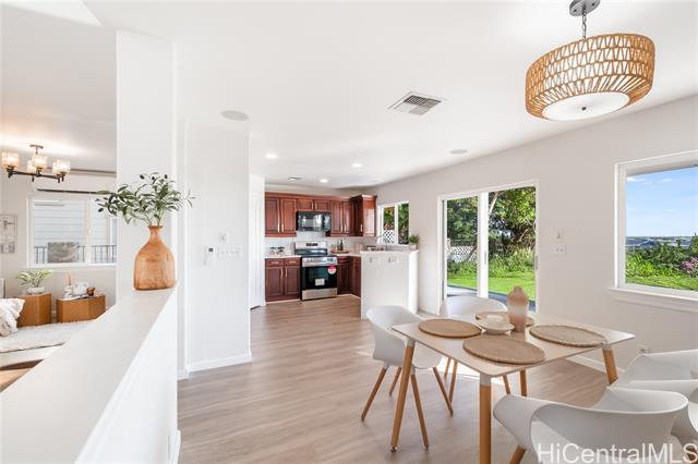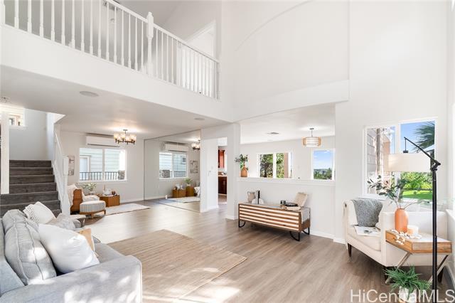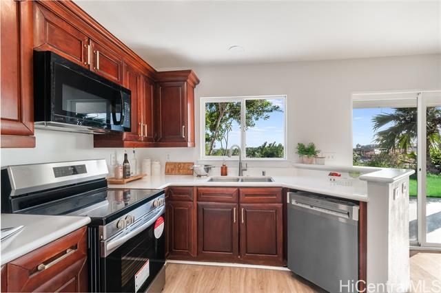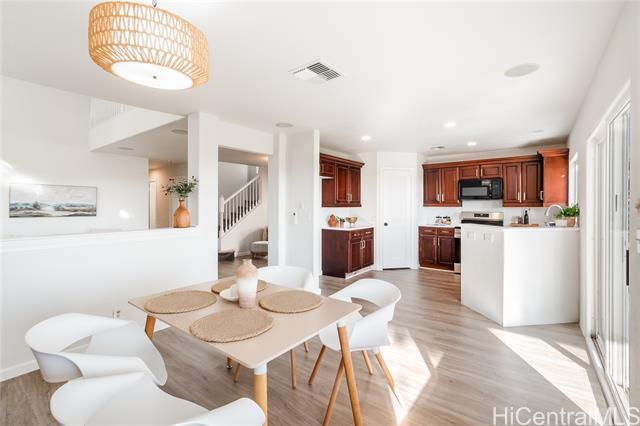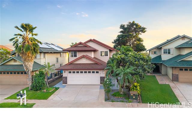 Your Kapolei Knolls hideaway — refreshed, private, and full of potential. Located in one of Kapolei’s most desirable neighborhoods, this home offers a peaceful setting with wide streets, well-kept homes, and a true community feel. Recently refreshed with new interior paint, updated vinyl plank flooring downstairs, new carpet upstairs, and brand-new appliances, it’s clean, bright, and ready for move-in. The flexible layout includes a convenient main-level suite, perfect for guests or multi-generational living. Upstairs bedrooms provide privacy and separation, while the open living areas create a comfortable flow for everyday life. Set on a rim lot with no rear neighbors, the backyard is cleared and ready for your landscaping vision — garden, entertainment space, or custom outdoor retreat. Enjoy cool breezes, ocean glimpses, and the quiet comfort Kapolei Knolls is known for. A rare opportunity to shape a beautiful home in a sought-after neighborhood close to shopping, dining, schools, and all the conveniences of West O?ahu. Contact your favorite Realtor® to schedule a showing.