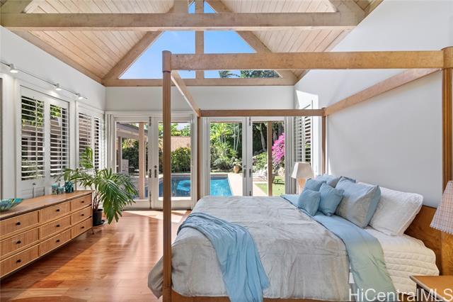 Enter through private gardens into this beautiful 4 bedroom/4 bath single level home that opens out to pool and nature setting in the back. Seamless indoor/outdoor living plus a separate bonus room above the garage. Fully walled in for privacy with new living room engineered wood floors, PV panels and glass panel garage doors. Dramatic open beams and windows throughout to catch the natural light. A serene and private setting. Welcome to your peaceful retreat.